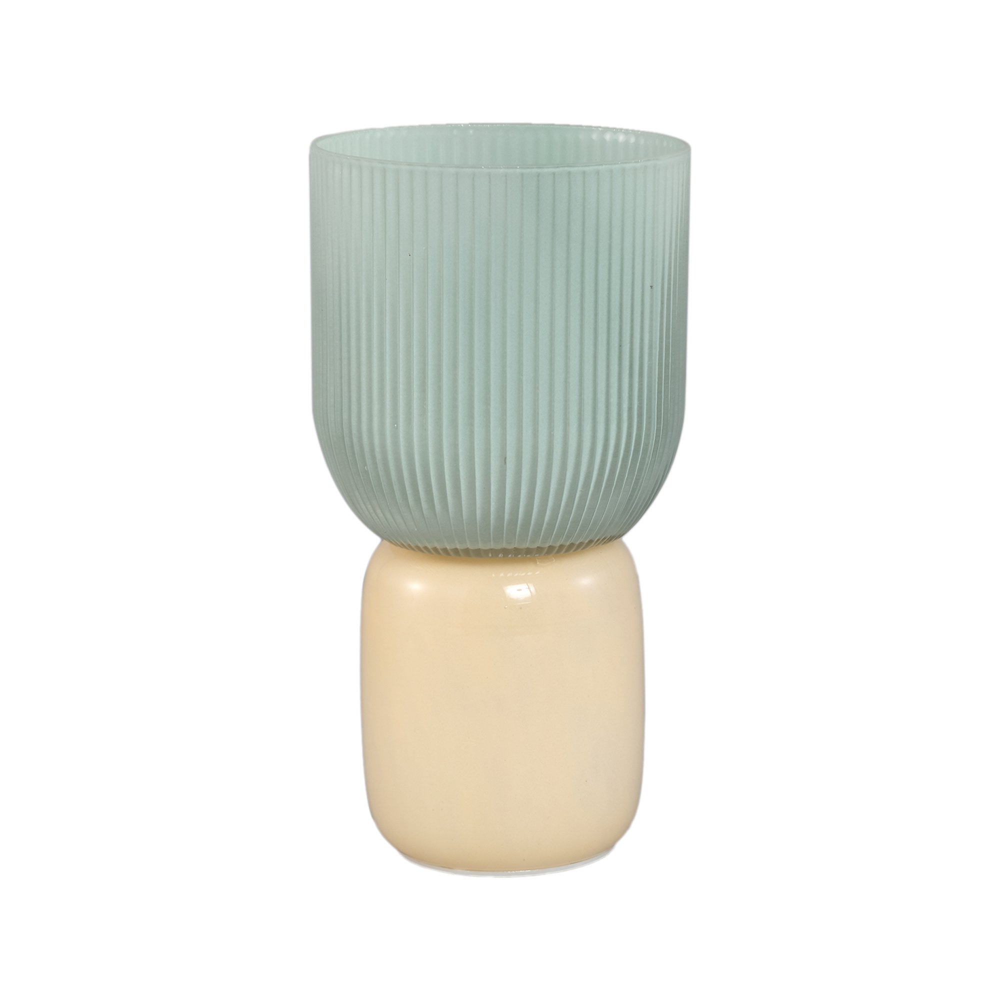 De geribbelde bovenkant van matgroen glas contrasteert prachtig met de glanzende crèmekleurige voet, waarin de verlichting subtiel verwerkt is. De pot is deels met de hand vervaardigd, wat elk exemplaar uniek maakt.