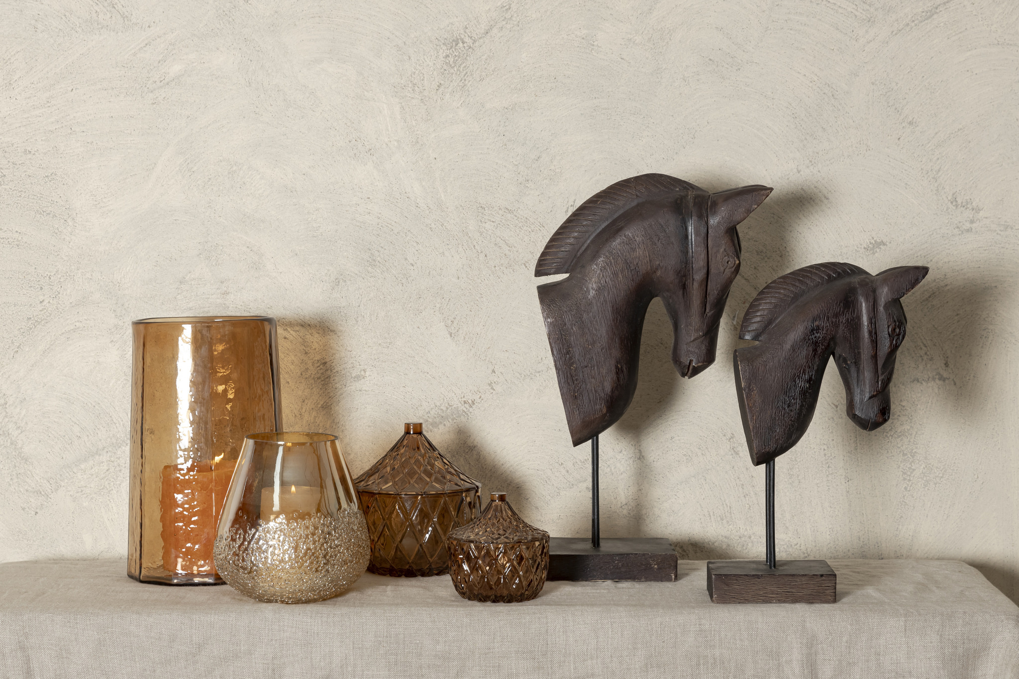 Met zijn compacte formaat (Ø20.5 × H20.5 cm) is dit windlicht ideaal om te combineren met andere maten uit de Ameara-serie voor een sfeervol geheel. Plaats er een waxinelicht of stompkaars in en geniet van het warme, uitnodigende licht dat door het amberkleurige glas schijnt.