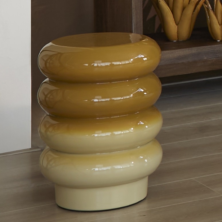 De MIROGI bijzettafel valt direct op door zijn glanzende okergele kleur, die een warme en uitnodigende sfeer creëert. Het ronde tafelblad met een diameter van 30 cm biedt voldoende ruimte voor decoratieve items, boeken of een kopje koffie. De combinatie van geel en bruin zorgt voor een speelse maar toch verfijnde uitstraling, ideaal voor zowel moderne als klassieke interieurs.