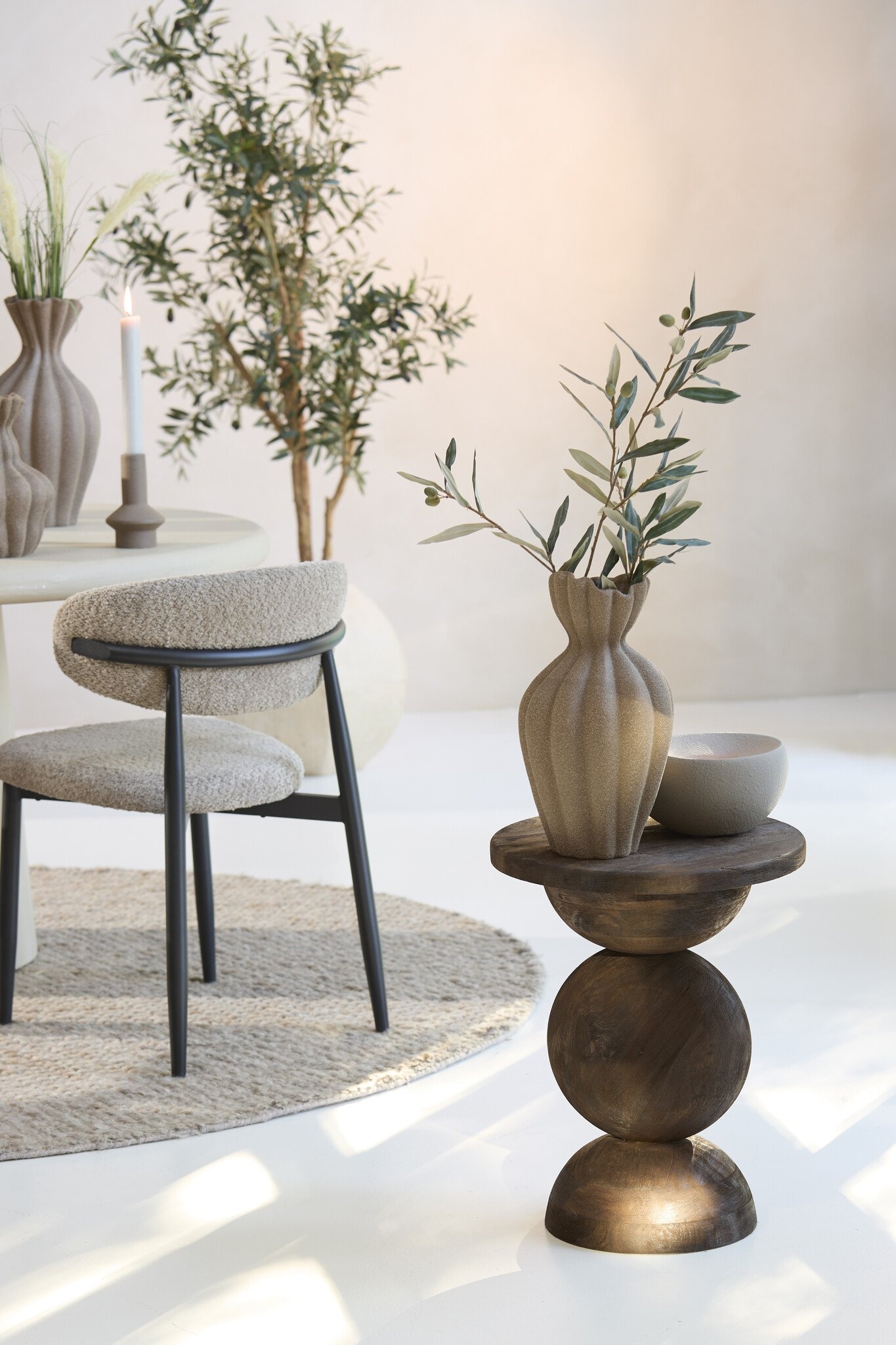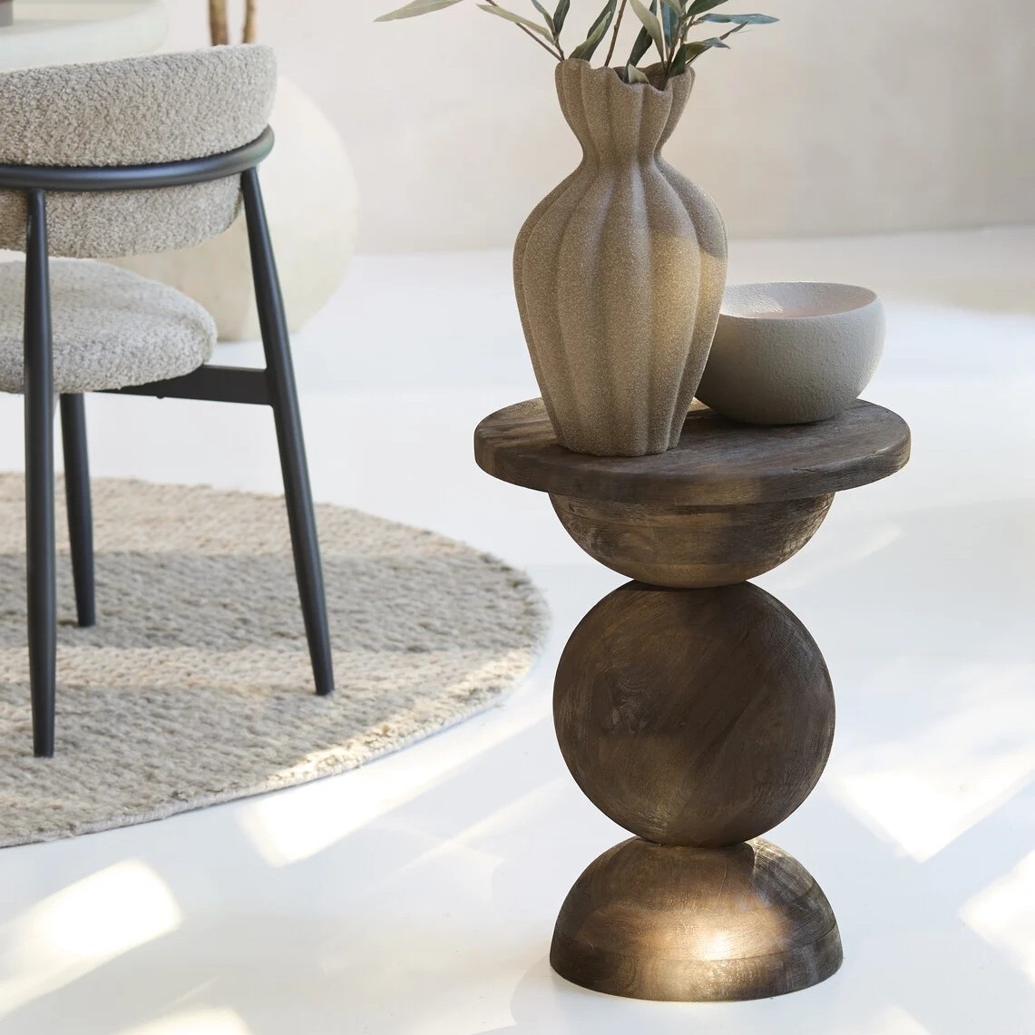 Maak een stijlvol statement in jouw interieur met de MIRTO bijzettafel Ø40x50 cm, een unieke houten bijzettafel met sculpturale vormen. De combinatie van een rond tafelblad en organisch gevormde basis geeft deze tafel een luxueuze, bijna artistieke uitstraling. Perfect als eyecatcher naast de bank, in de leeshoek of als podium voor een mooie vaas of plant.