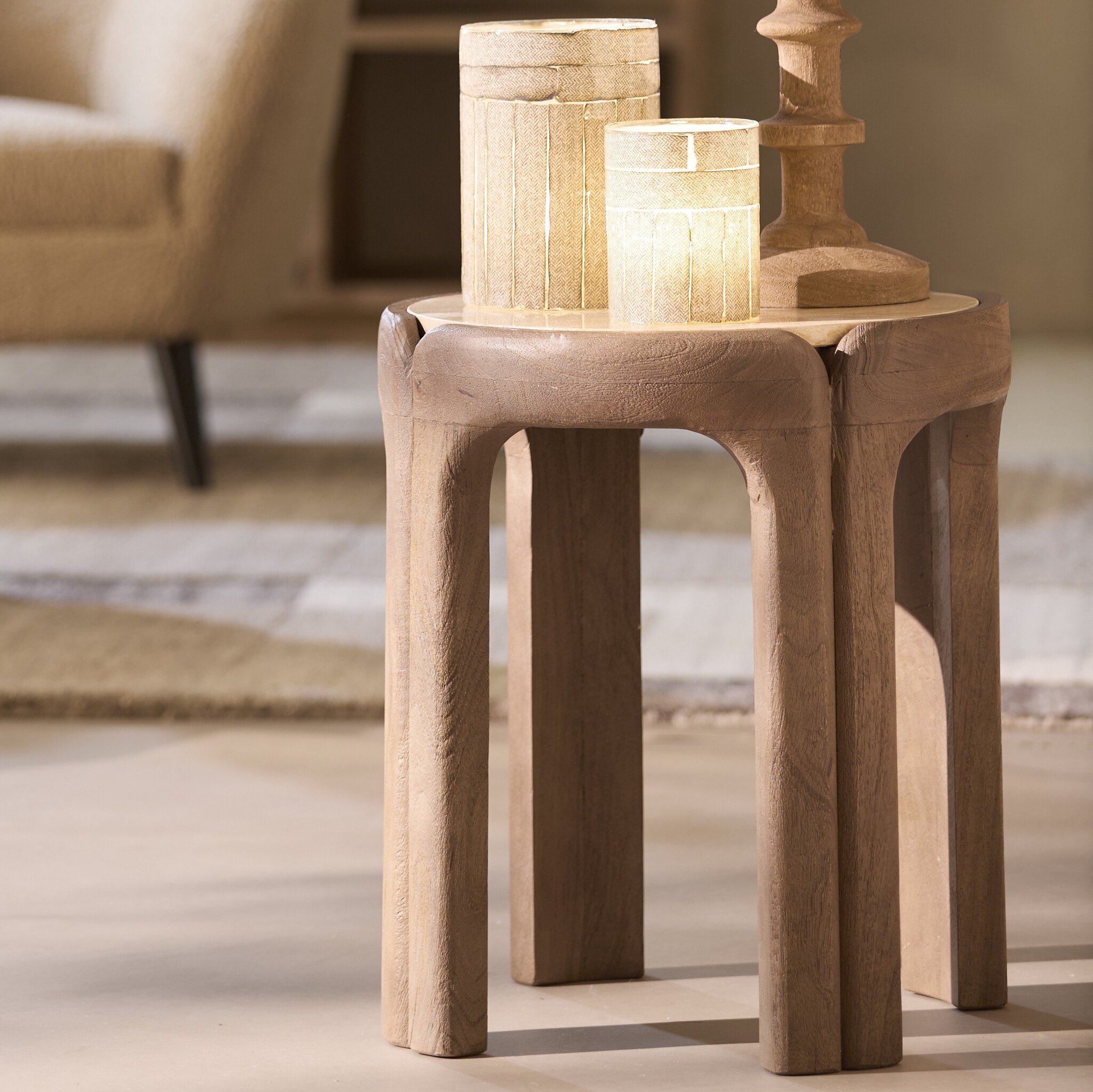 Gebruik de ALI bijzettafel naast de bank, als plantentafel, of als luxe accent in een slaapkamer of hal. Het stevige travertin blad biedt voldoende ruimte voor een lamp, vaas of decoratief object.