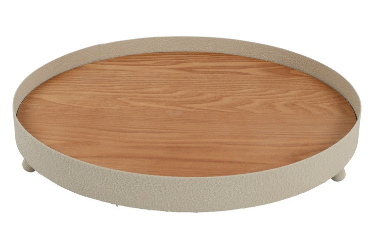 Het Dienblad Deane S crème is een stijlvol en functioneel woonaccessoire dat moeiteloos rust en elegantie toevoegt aan je interieur. Dit ronde dienblad combineert een slank metalen frame met een warme houtlook bodem, afgewerkt in een zachte crèmetint. De opstaande rand zorgt niet alleen voor een verfijnde uitstraling, maar maakt het dienblad ook praktisch in gebruik.