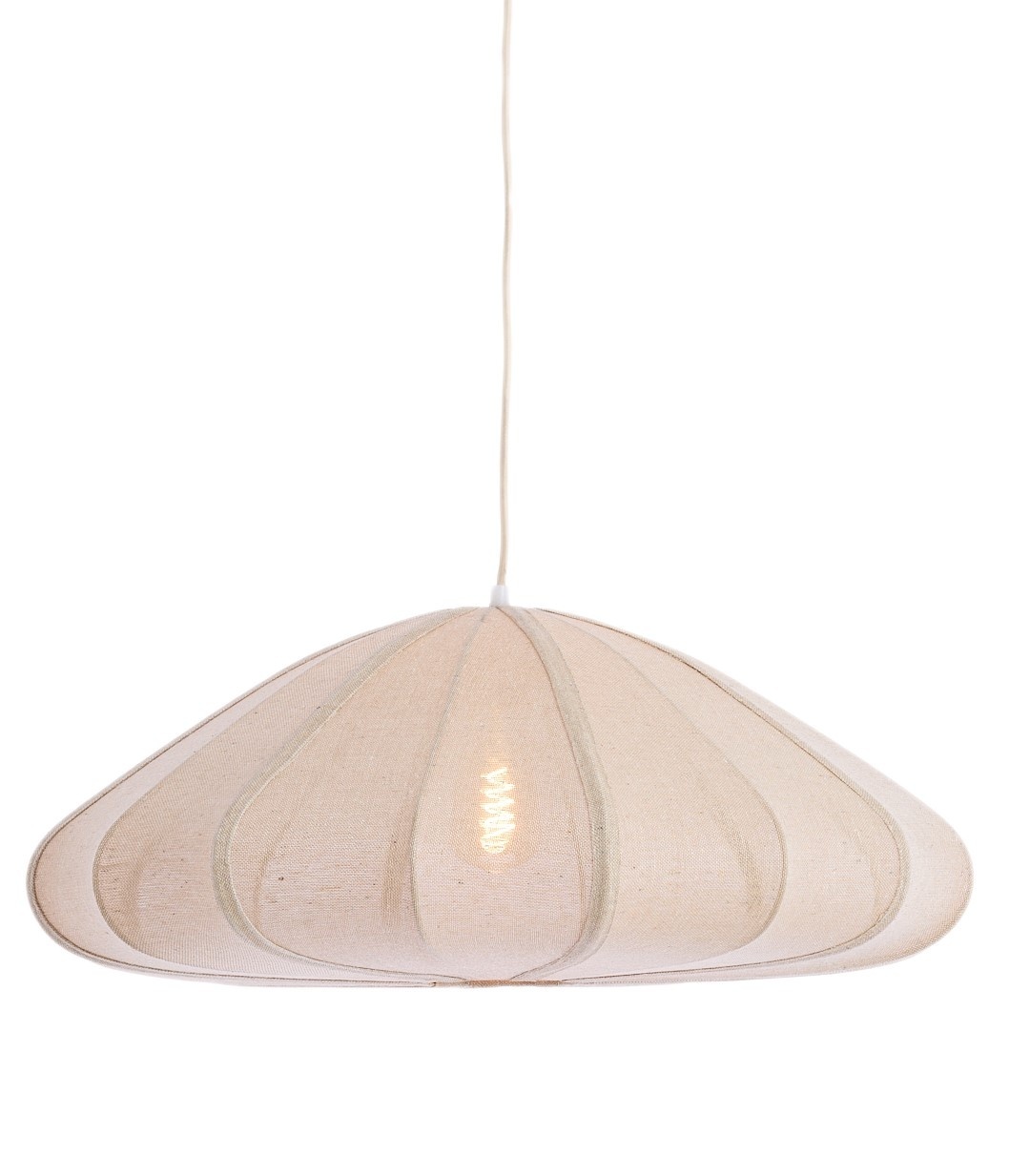Deze hanglamp verspreidt het licht prachtig. Het licht schijnt prachtig door de stof van de lamp heen. De lamp geeft een luchtig en chique sfeer, verkrijgbaar in de kleuren naturel en roze in verschillende afmetingen.