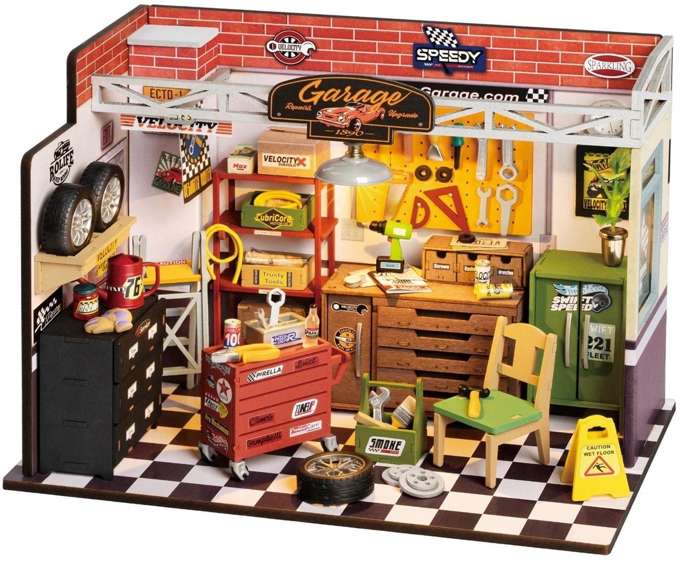 De DG165 Robotime Garage Workshop is een stoer houten bouwpakket van Rolife, speciaal ontworpen voor volwassenen en kinderen vanaf 14 jaar. Dit miniatuurmodel stelt een garagewerkplaats voor, compleet met gereedschap zoals sleutels, schroevendraaiers en zagen. Daarnaast zijn er banden om te verwisselen, oliekannen en een rolgereedschapskast. Dit samen met een werkbank, geeft de werkplaats een realistisch karakter.