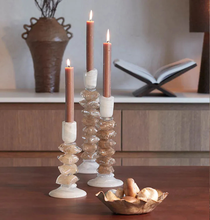 Gemaakt van glas met een unieke marmerlook afwerking straalt ESTINA een luxueuze en artistieke uitstraling uit. De subtiele glans en het organische design maken deze kandelaar perfect voor moderne, boho en eclectische interieurs.