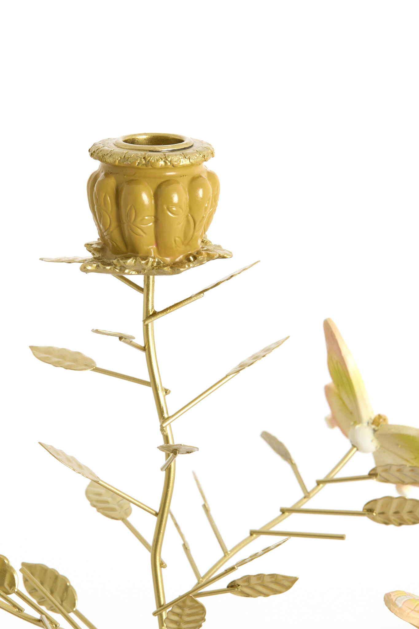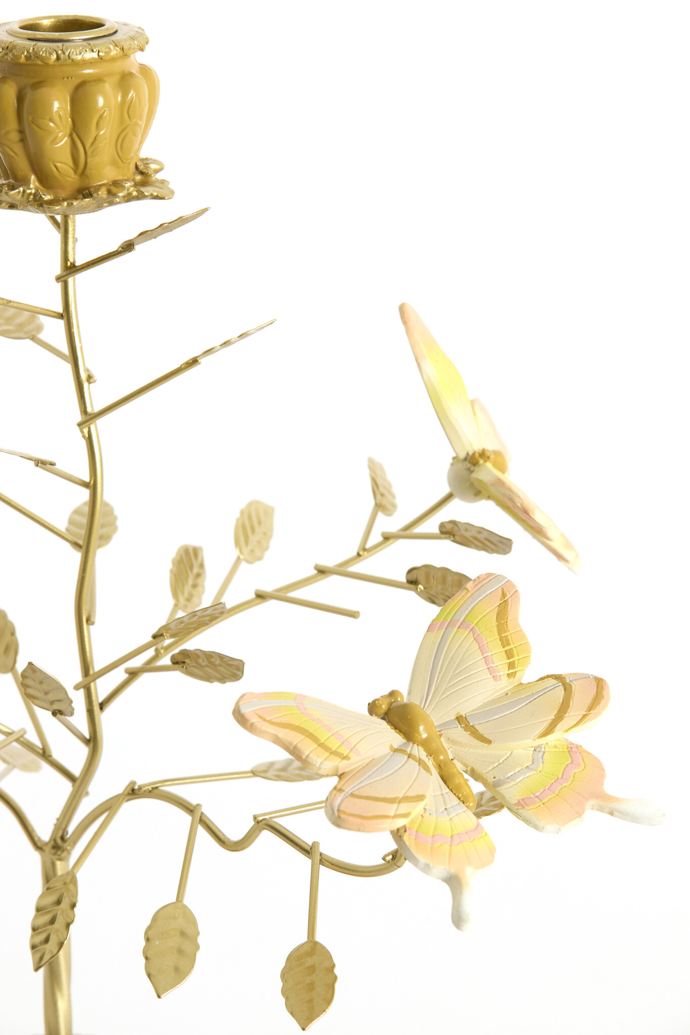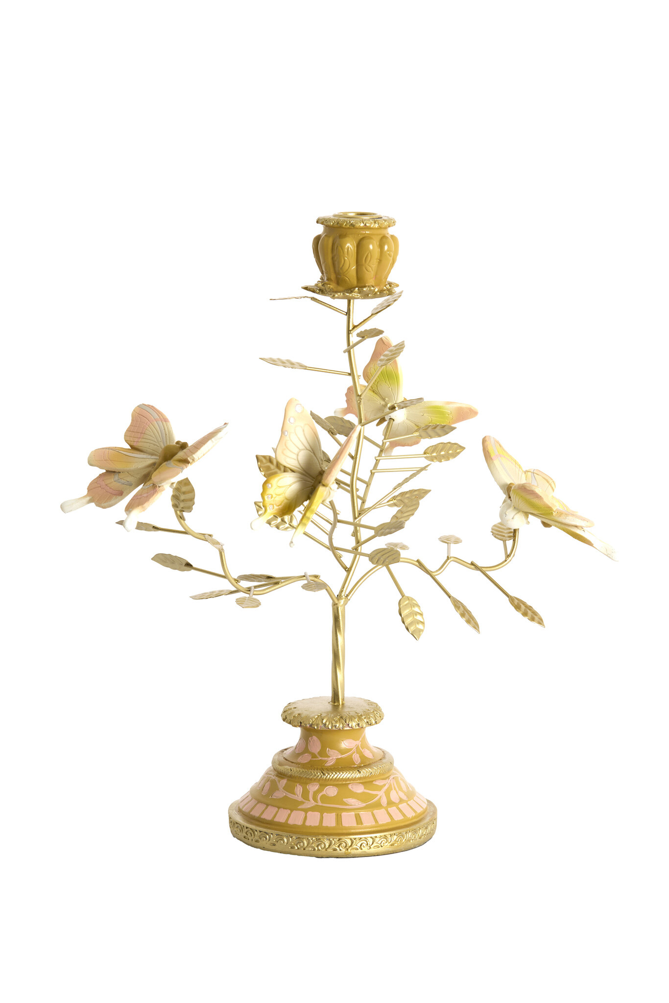 De BUTTERFLY kandelaar is verkrijgbaar in twee kleurvarianten: lichtgroen met lichtgoud en lichtroze met lichtgoud. Beide uitvoeringen hebben een zachte, verfijnde uitstraling en passen perfect binnen romantische, klassieke en eclectische woonstijlen. Ook in een modern interieur zorgt deze kandelaar voor een speelse, elegante twist.