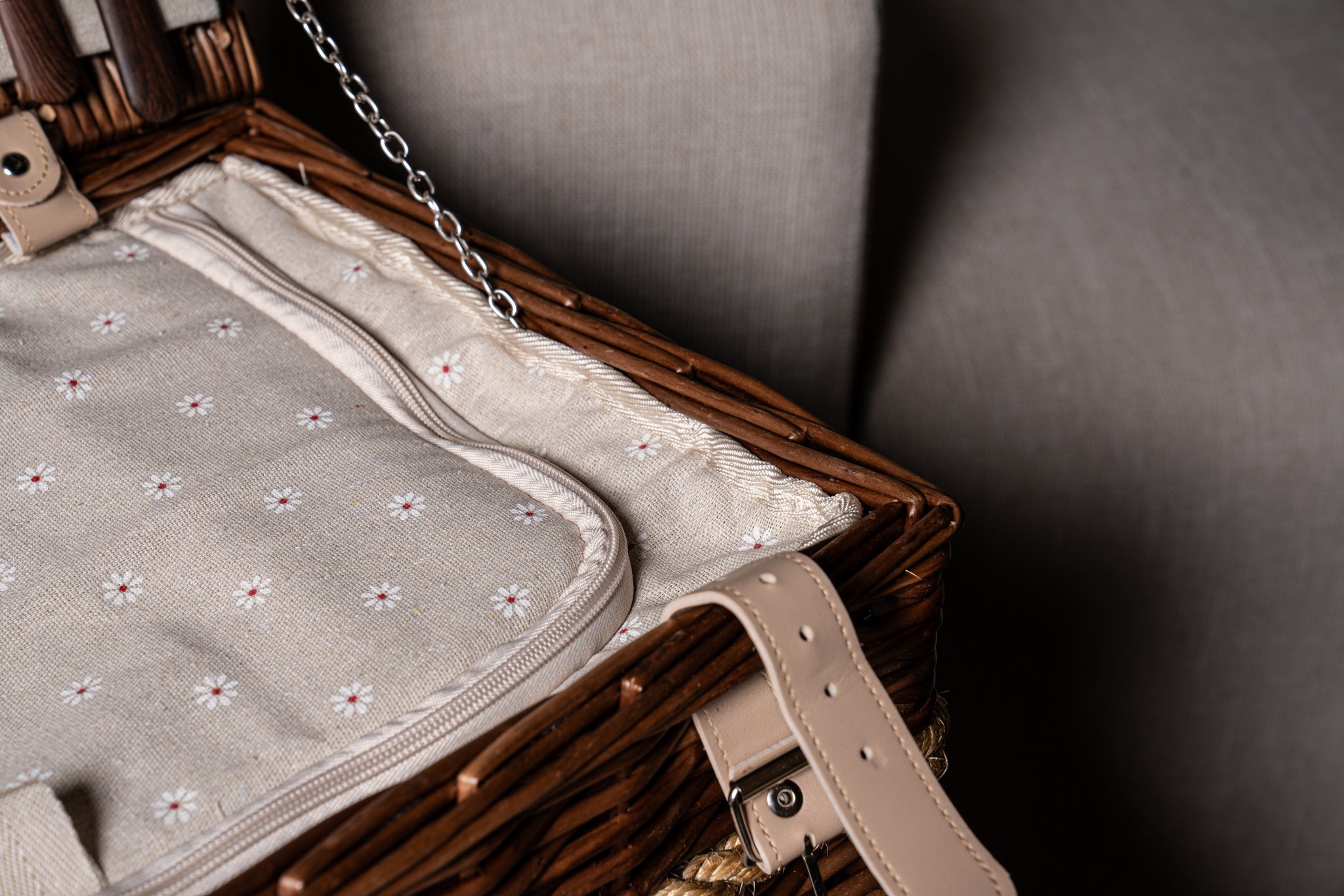 De mand is gemaakt van bruin gevlochten wilgenhout en voorzien van natuurlijke juten binnenvoering met geborduurde bloemetjes. Een rustieke, romantische uitstraling die perfect past bij de sfeer van een picknick in de natuur.
