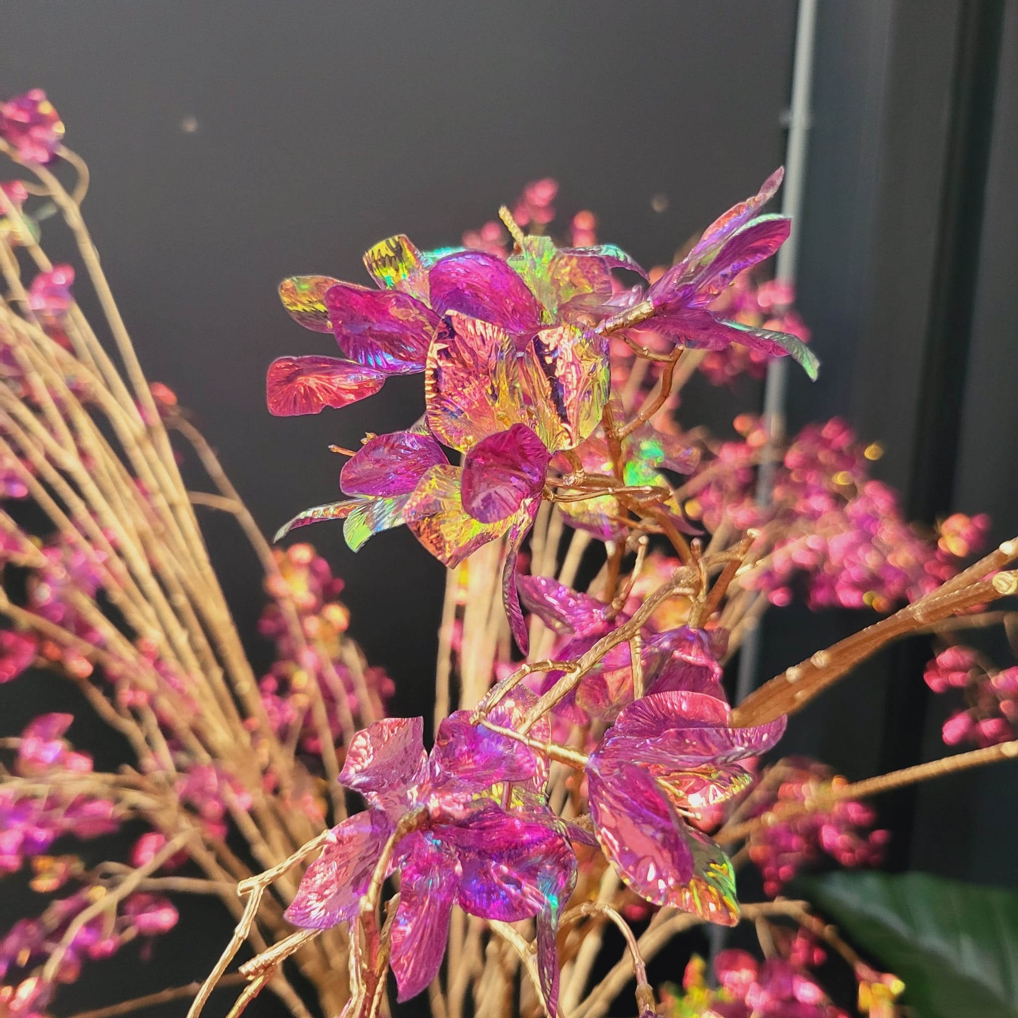 De kunstbloem wild Hortensia paars iriserend straalt levendige elegantie uit en voegt een speels kleuraccent toe aan elk interieur. De subtiele iriserende glans geeft de delicate bloemblaadjes een levendig effect dat prachtig het licht vangt.