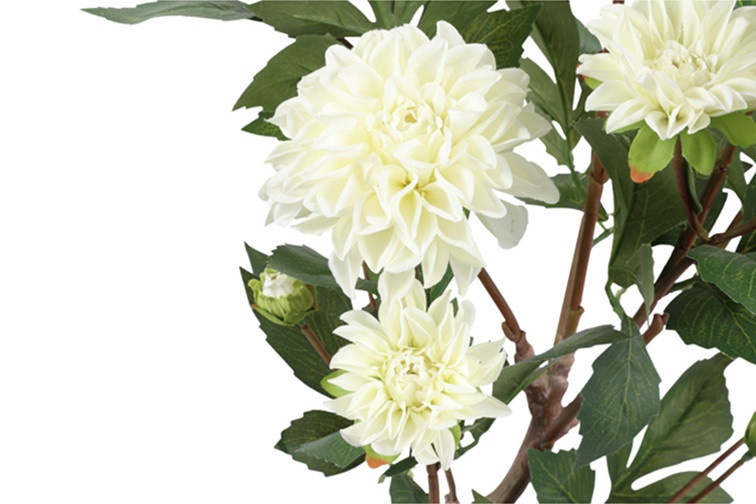 Deze natuurgetrouwe kunst Dahlia is opgebouwd uit een stam van waaruit volkunststof takken met hun kunstzijden bladeren en bloemen groeien. Dankzij deze flexibele constructie kun je deze kunstplant met bloemen in geheel naar wens vormgeven.