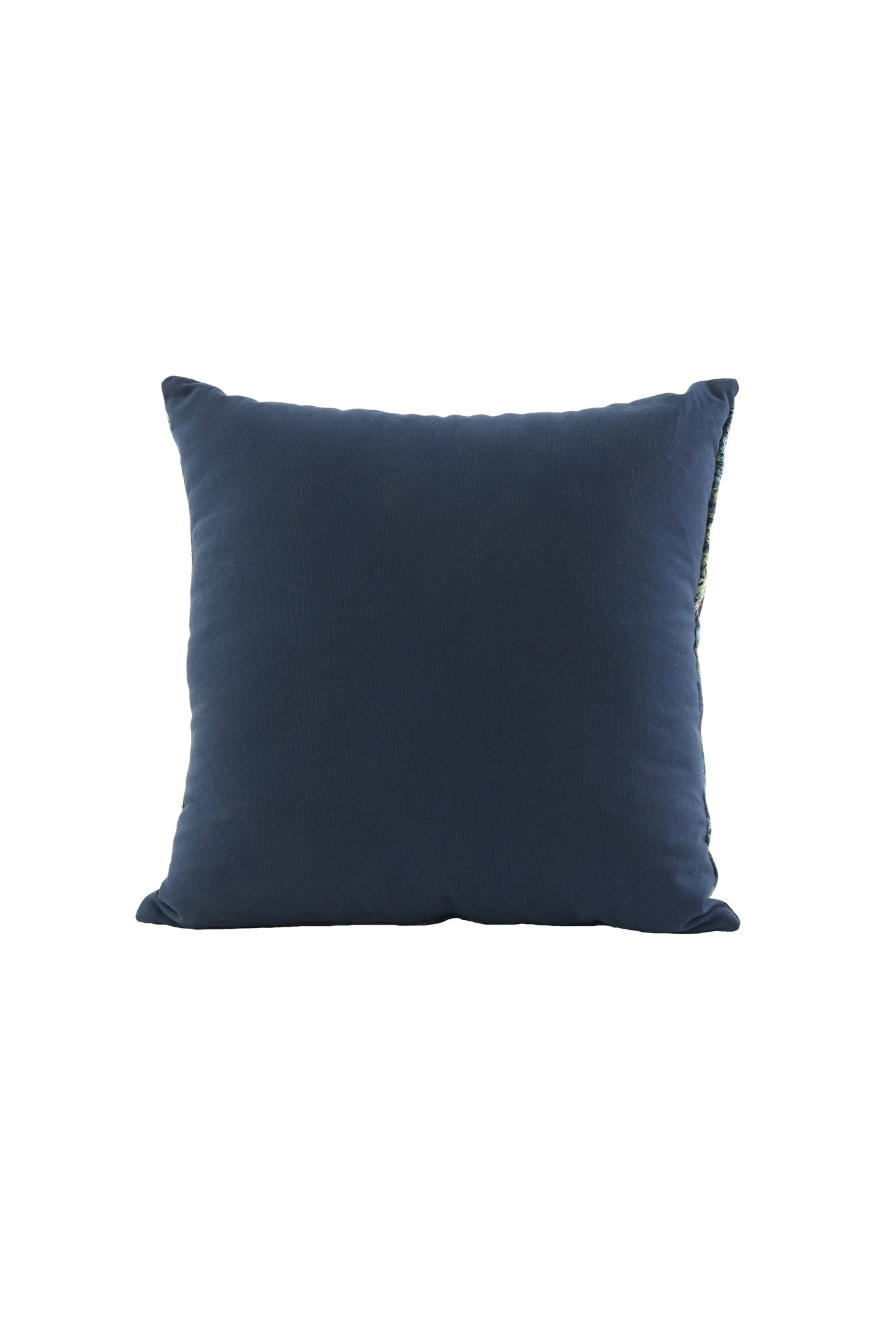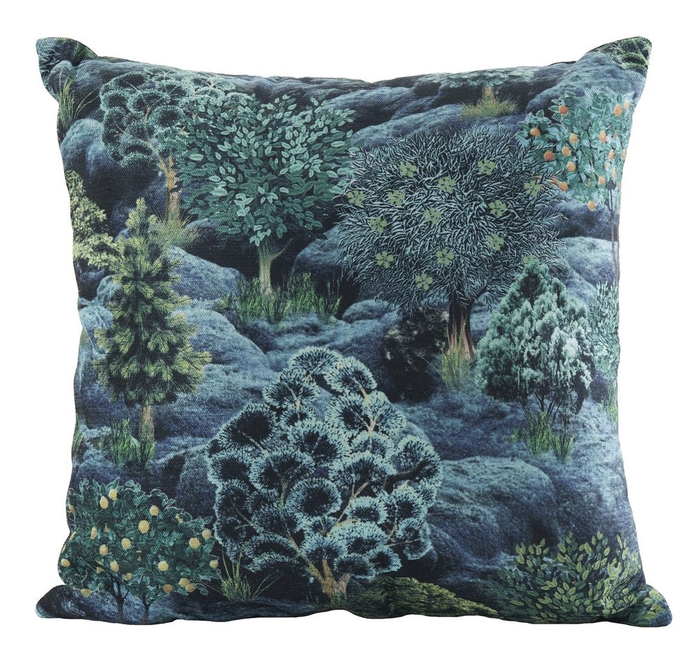 Dit kussen heeft een mooie warme print van een bosrijke omgeving met warm groene en blauwe kleuren.