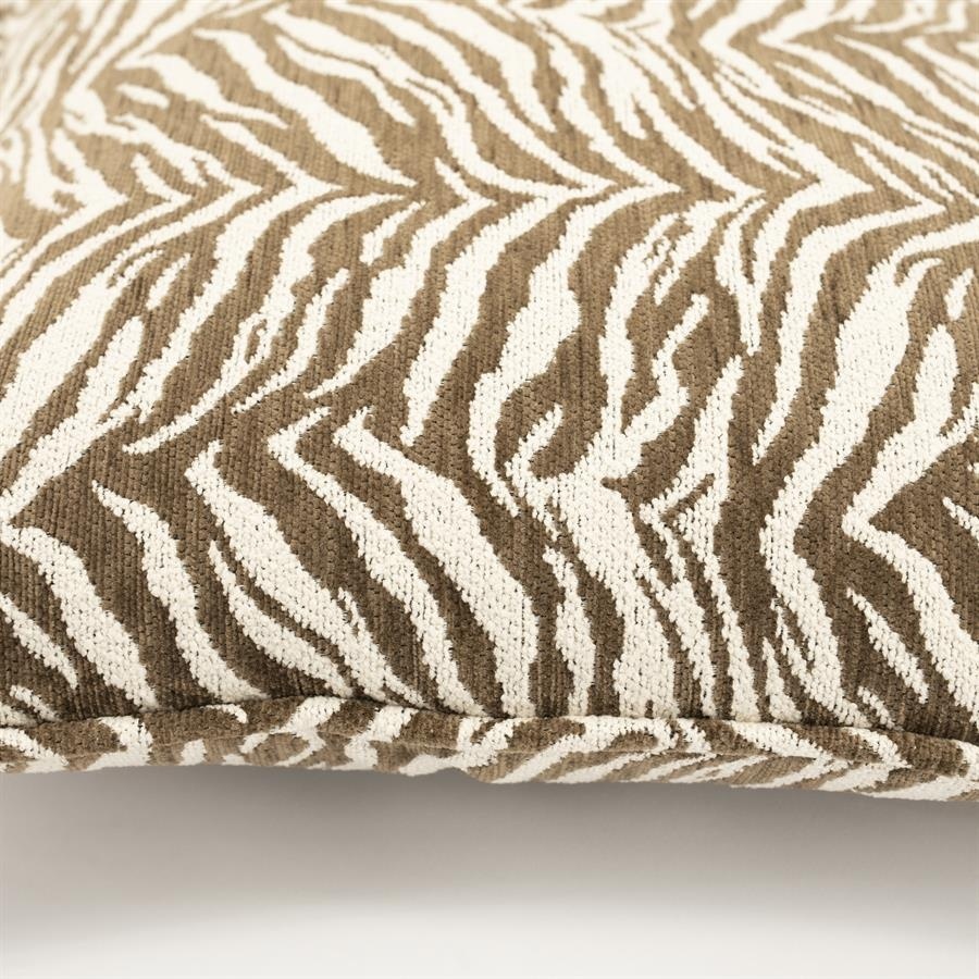 Het Kussen Tigra bruin komt prachtig tot zijn recht in een interieur met natuurlijke materialen zoals hout en linnen. Combineer het met neutrale tinten of mix met de groene, mosterd en beige variant voor een stijlvol geheel.