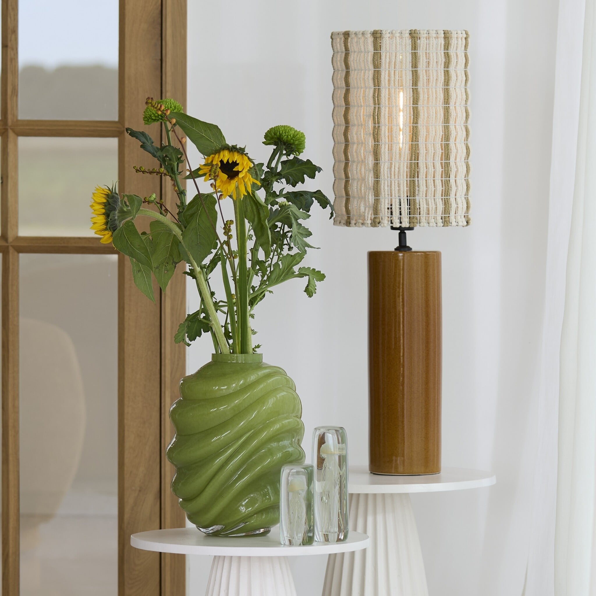 De combinatie van crème met olijfgroene accenten maakt deze lampenkap bijzonder veelzijdig. De zachte aardetinten sluiten perfect aan bij populaire woonstijlen zoals: