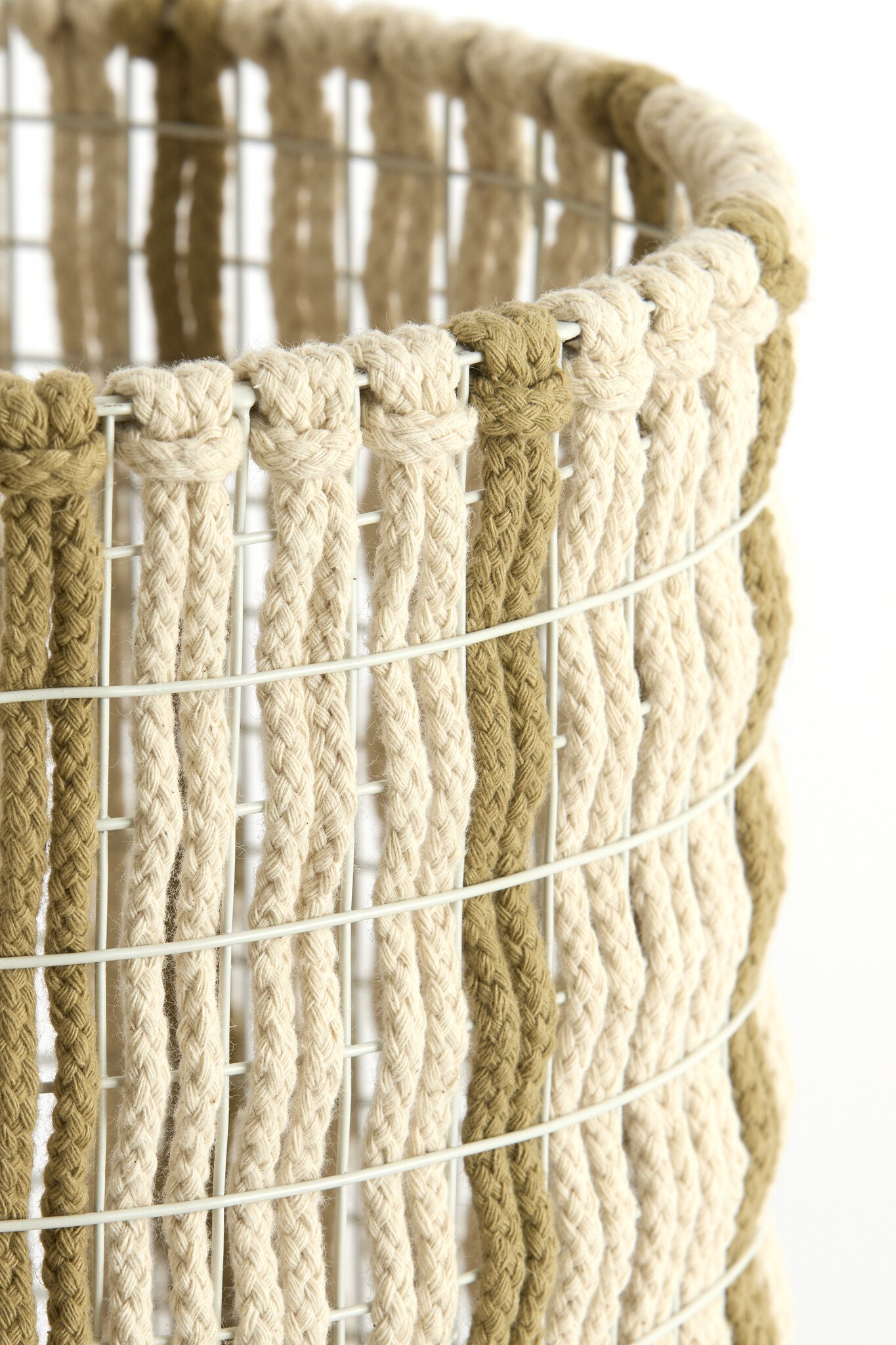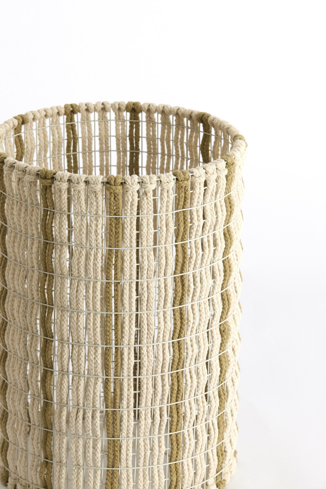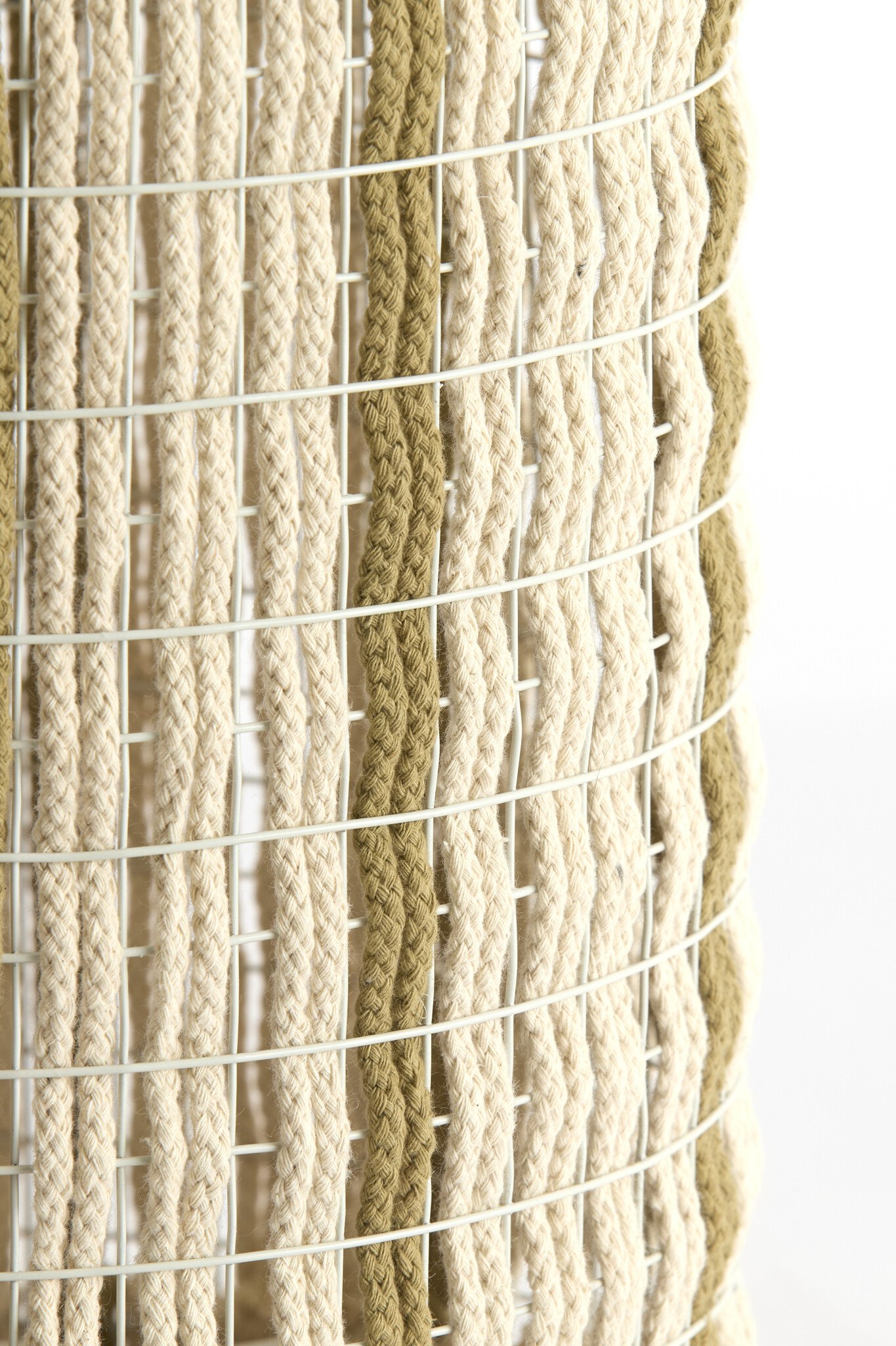 Het verfijnde metalen frame is rondom afgewerkt met verticaal gevlochten touw, wat zorgt voor een speels en ambachtelijk karakter.