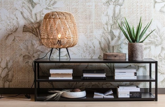Deze gevlochten tafellamp Moza komt uit de collectie van het Nederlandse WOOOD Exclusive en is vervaardigd uit bamboe met een naturel afwerking en staat op een zwarte, ijzeren 3 poot. Door de open structuur van de kap verspreid de lamp een sfeervol licht en past hij in meerdere interieurstijlen.