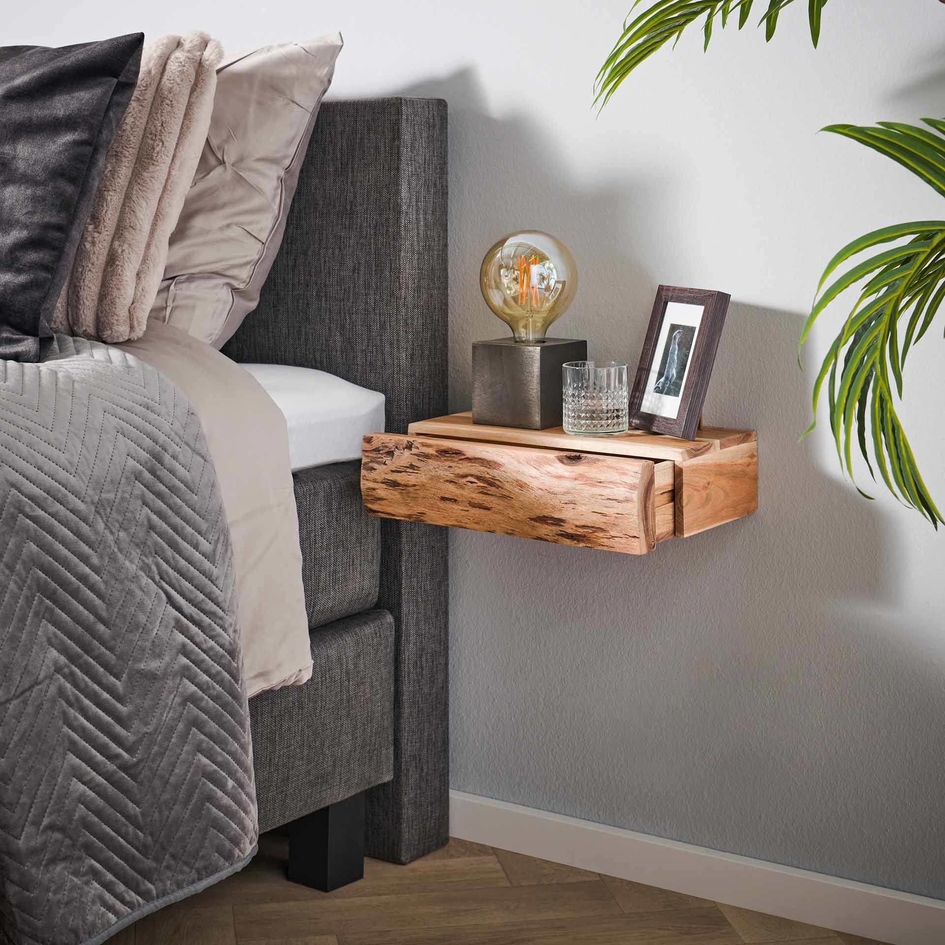 Dit nachtkastje 'tree L' bestaat uit een set van twee. Het setje is uitgevoerd in acacia hout met een live edge lade. Het nachtkastje wordt door middel van 2 schroeven aan de wand gemonteerd. Dit setje is er ook nog in een kleinere uitvoering.