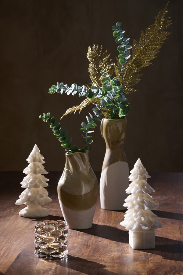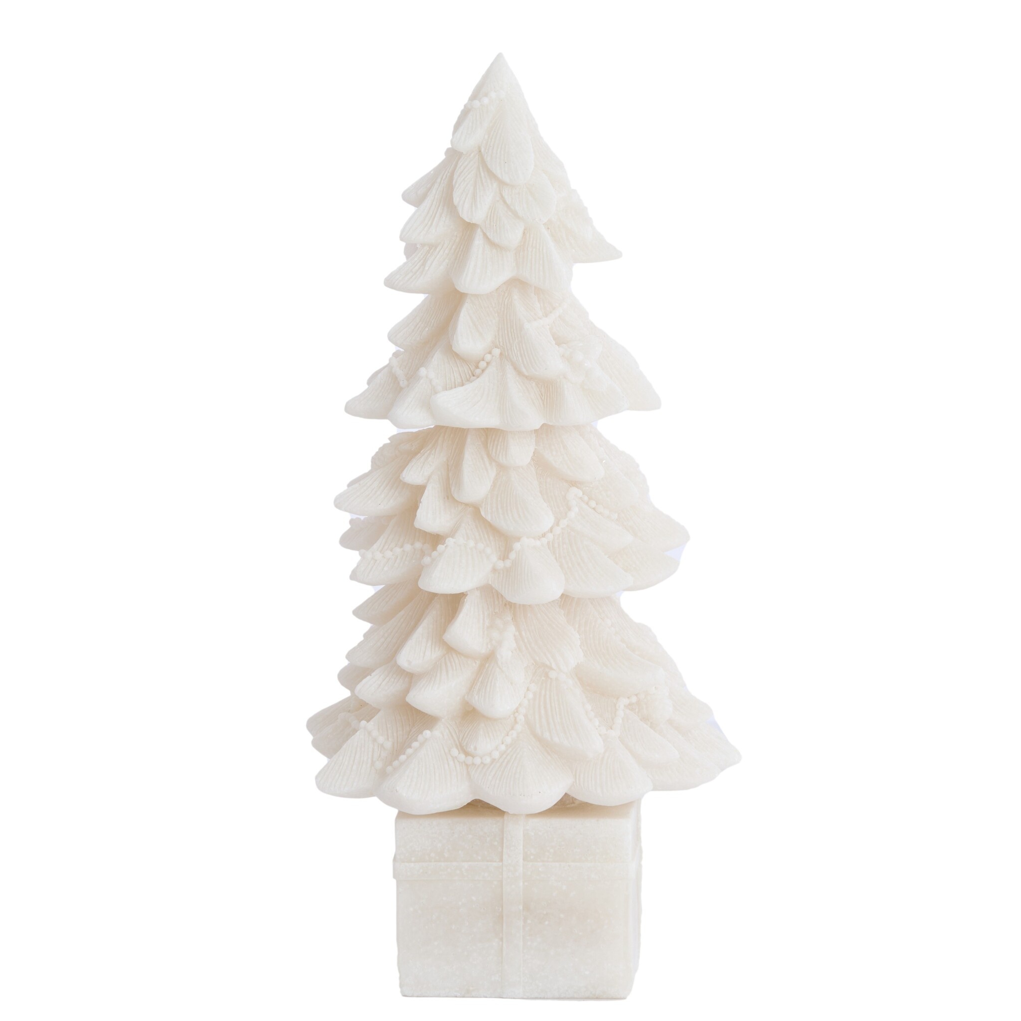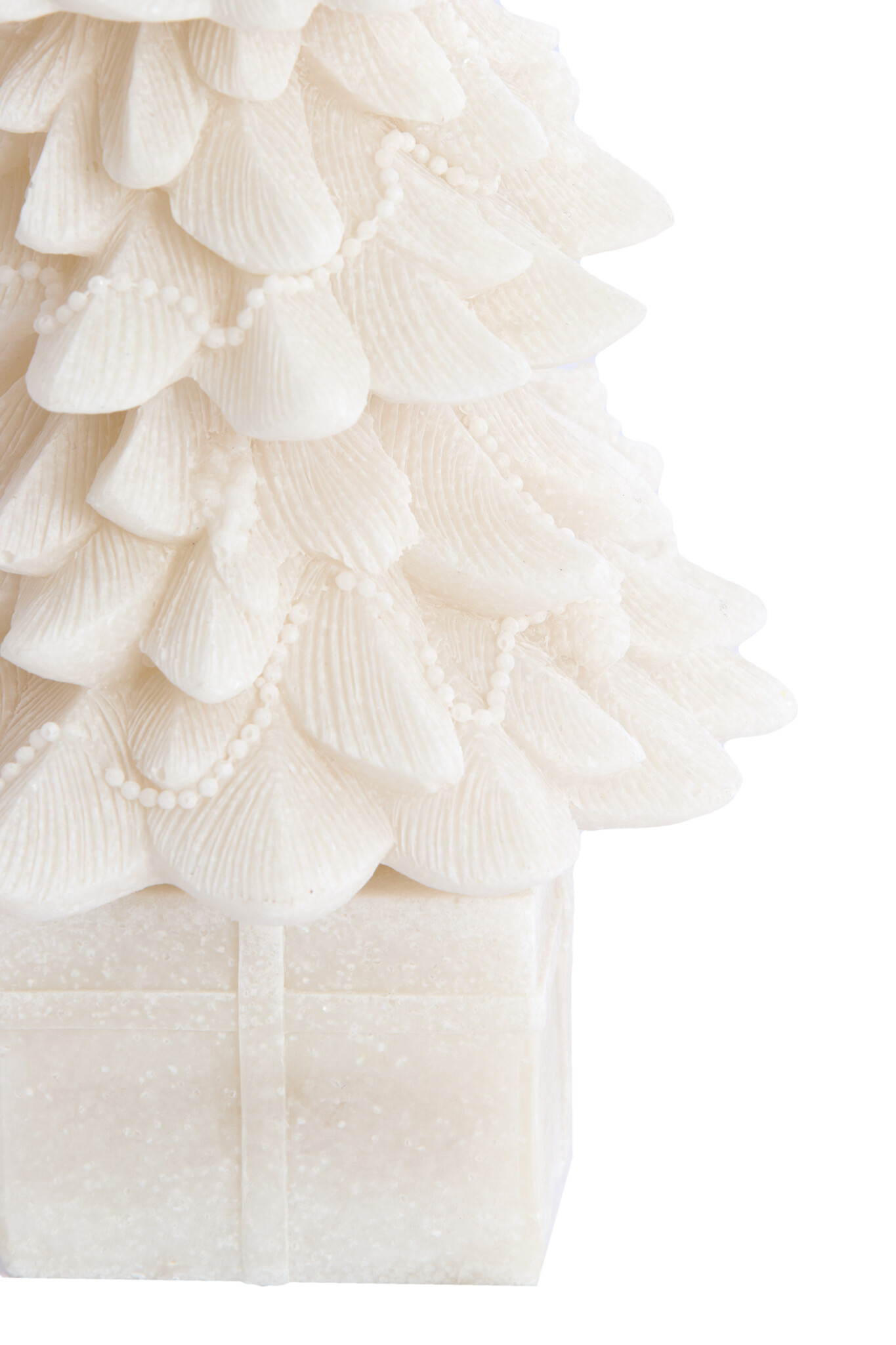 Dit prachtige decoratiestuk in een zachte beige kleur is uitgevoerd in een verfijnde dennenboomvorm met elegante details, geplaatst op een blokvormige voet. Met een afmeting van Ø13x25 cm is dit ornament perfect voor op tafel, een dressoir, vensterbank of in een feestelijk kersttafereel.