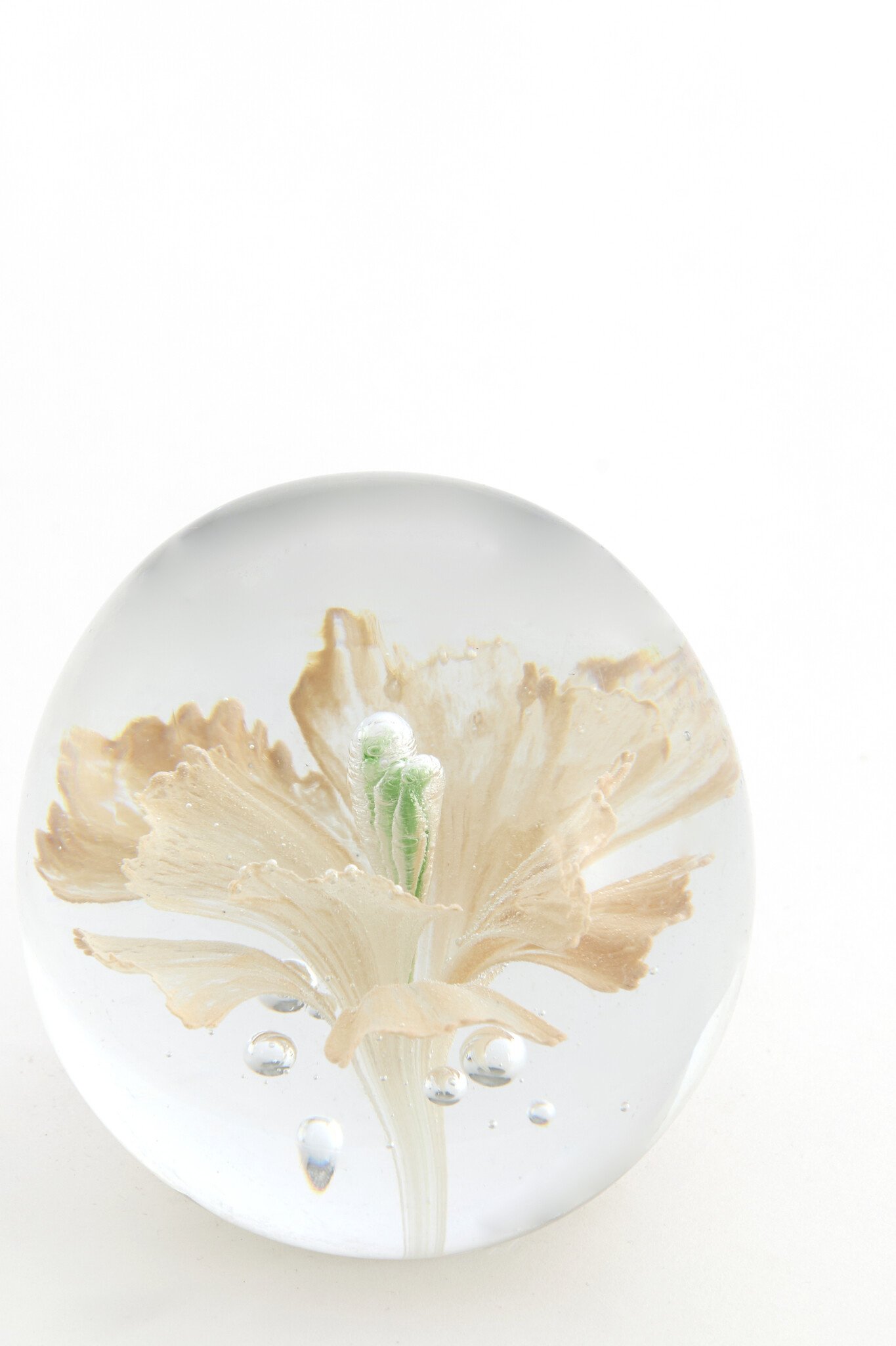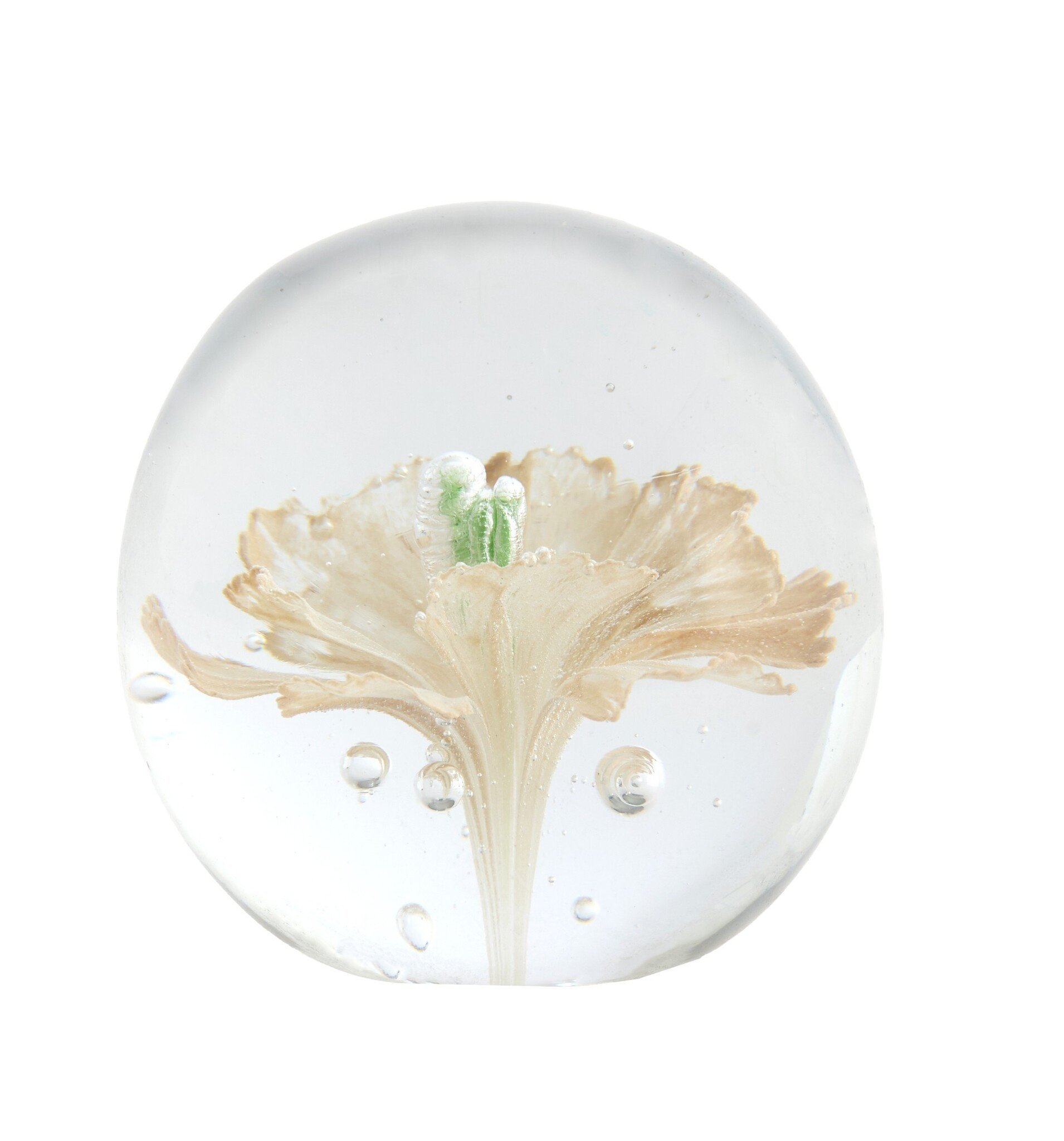 Het ornament is vervaardigd uit hoogwaardig glas en heeft een gladde, luxe afwerking. De bloem lijkt te zweven in het glas, wat zorgt voor een bijzondere diepte en een speels lichteffect wanneer het licht erop valt.