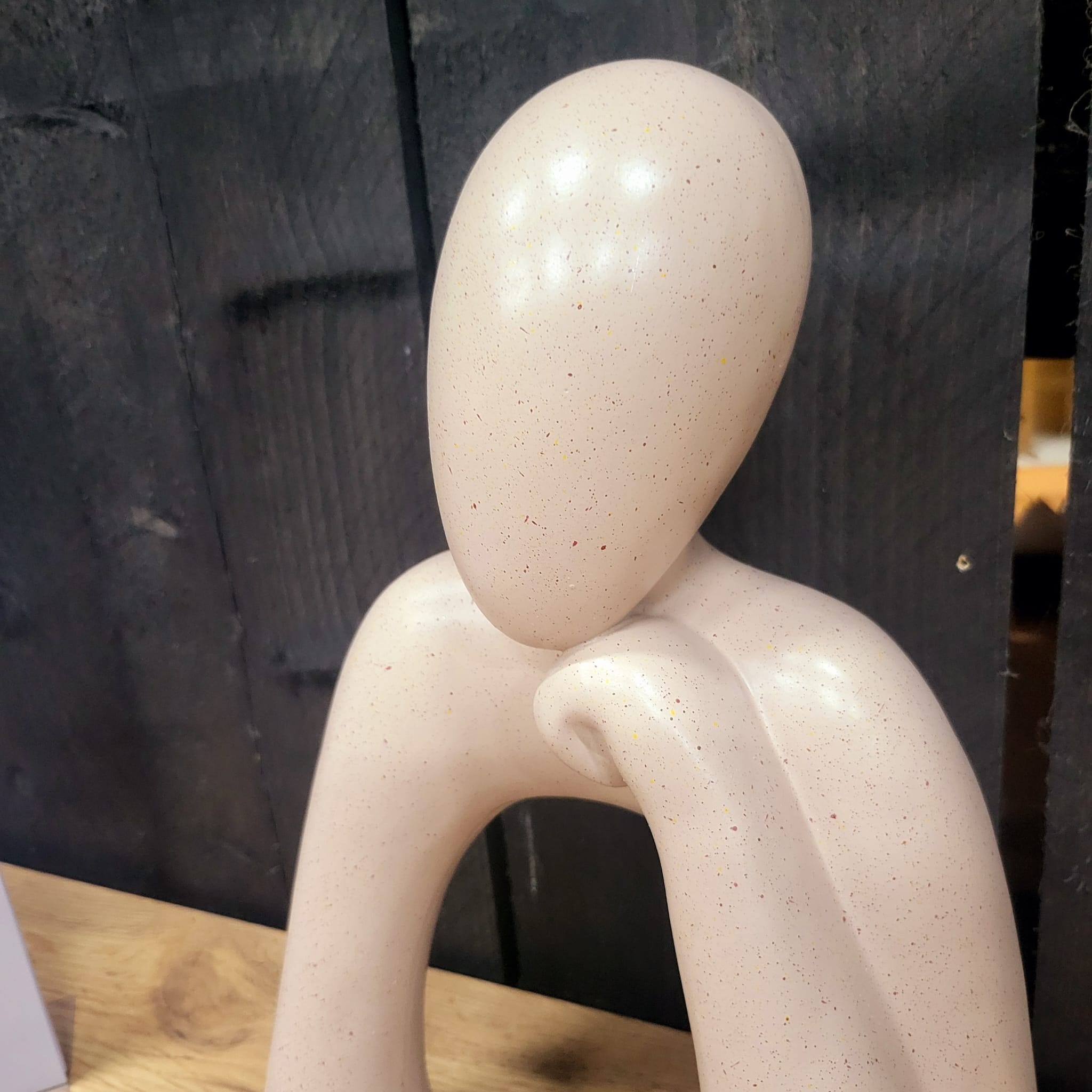 Dit decoratieve beeld nodigt uit tot interpretatie: is het een denkend figuur, een moment van introspectie, of gewoon een kunstzinnig statement? Waar je het ook plaatst – op een wandplank, vensterbank of side table – het trekt altijd subtiel de aandacht.