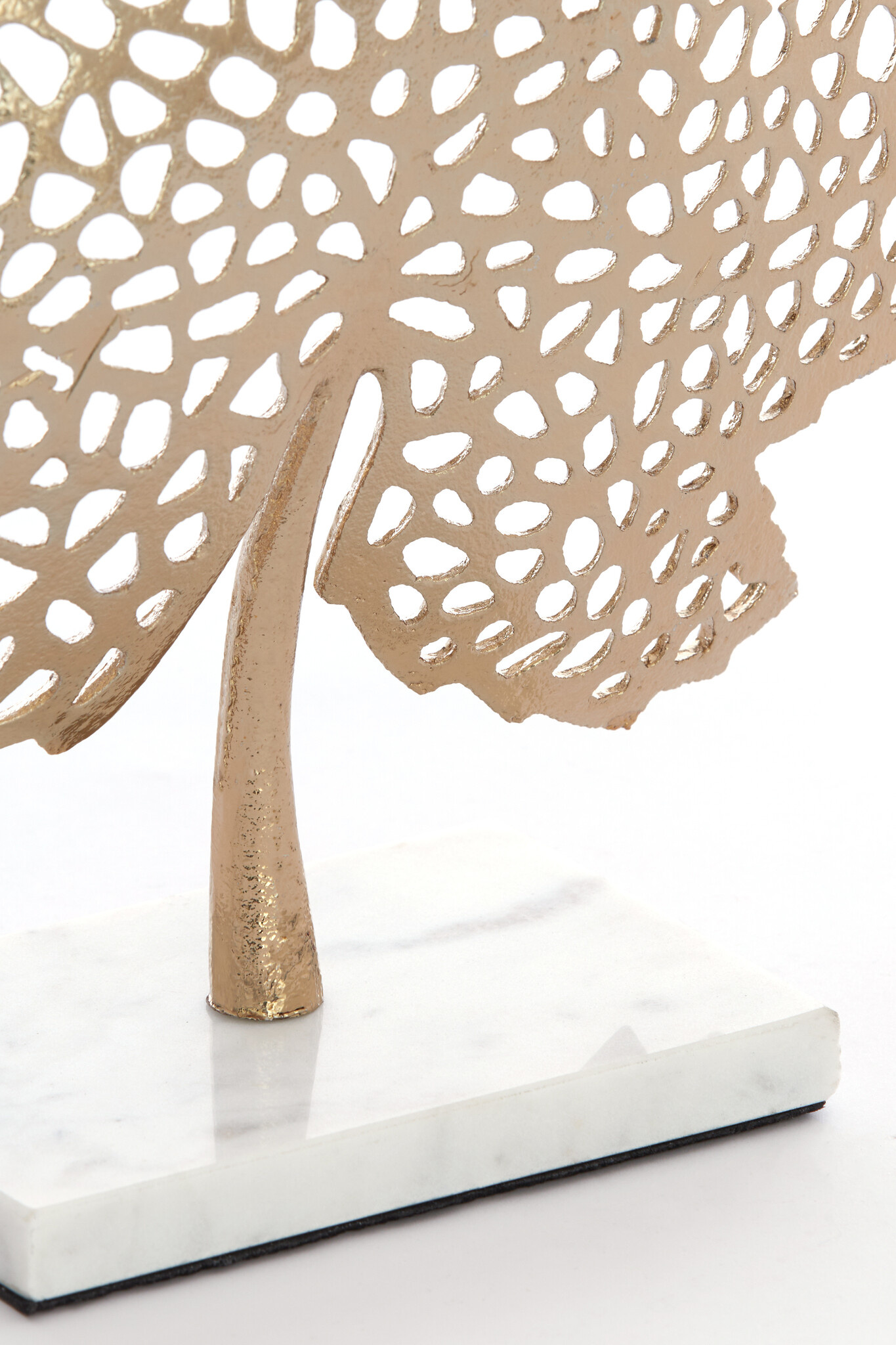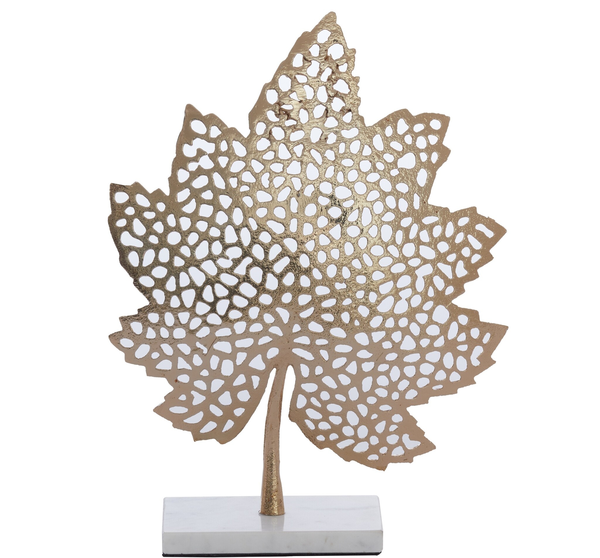 Zoek je een unieke accessoire dat jouw woning opfleurt? Deze decoratie is de perfecte aanvulling op elke kamer. Met dit ornament creëer je heel gemakkelijk een chique en bijzondere sfeer. De marmeren voet met het mooie gouden opengewerkte blad maakt dit een heel sfeervol interieurstuk. Plaats er bijvoorbeeld een (led) kaars achter om het licht mooi door het opengewerkte blad te verspreiden.