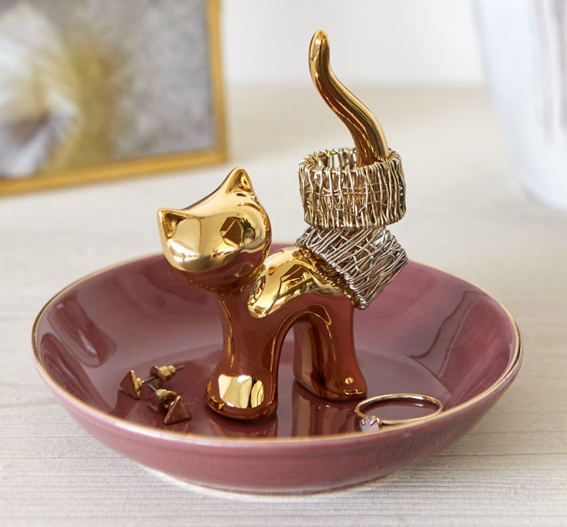 Er zijn drie verschillende varianten. Zo is er een paars schaaltje met een goudkleurige kat en een grijs schaaltje met een goudkleurige hond. Naast sieraden is dit schaaltje ook heel handig om te gebruiken voor kleine dingen die je makkelijk kwijt raakt, zoals haarknipjes of sleutels.