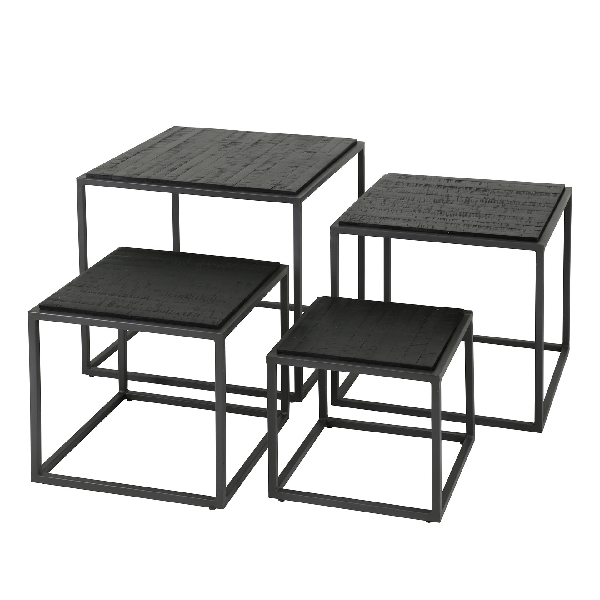 Deze salontafel set "Teca black" is gemaakt van verweerd teakhout met een zwarte afwerking en een gun metal frame. De set is ingelegd met houten stroken wat een strak en sfeervol effect geeft.