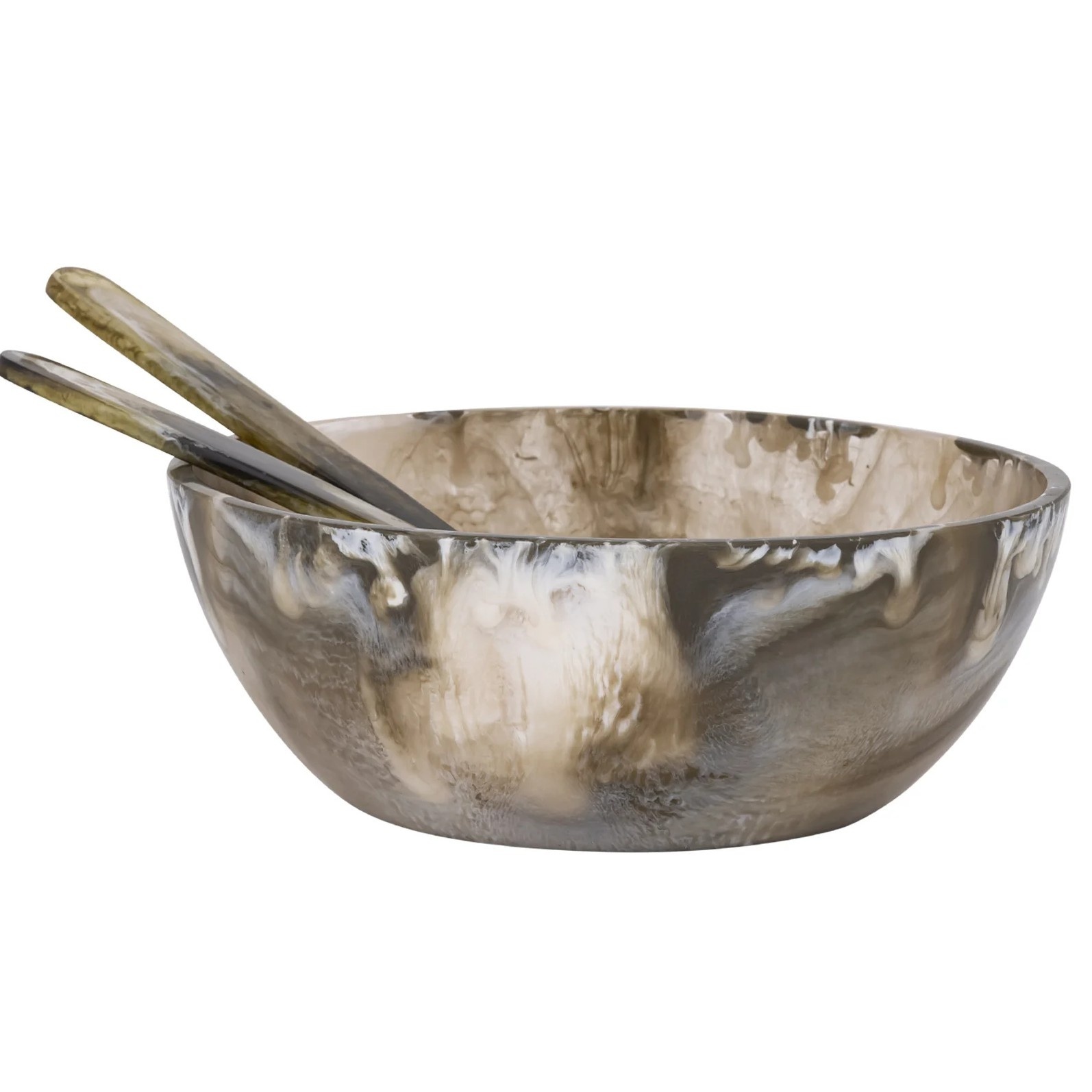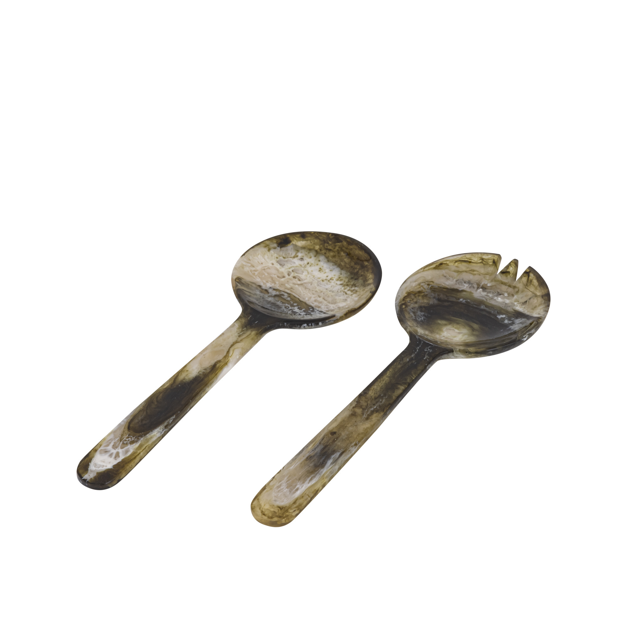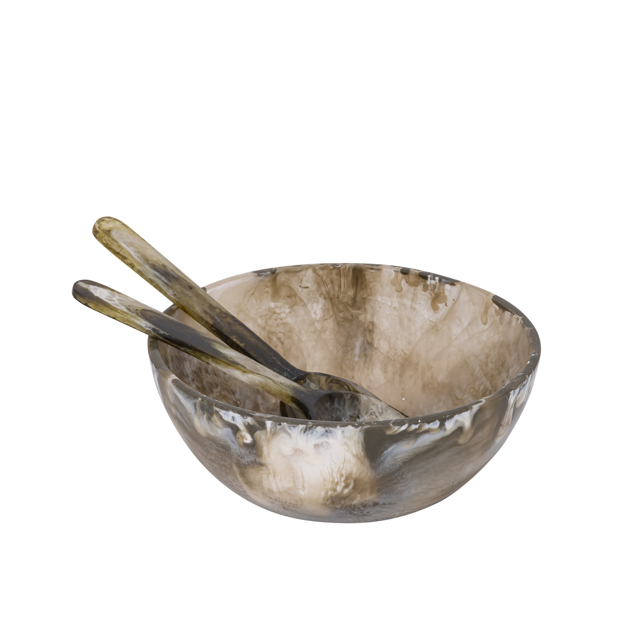 Deze schaal en de bijpassende opscheplepels zijn handgemaakt van polyresin. Dit hoogwaardige materiaal is licht, sterk en uitstekend geschikt voor organische vormen. Door het ambachtelijke productieproces is elk exemplaar uniek in kleurnuance en patroon.