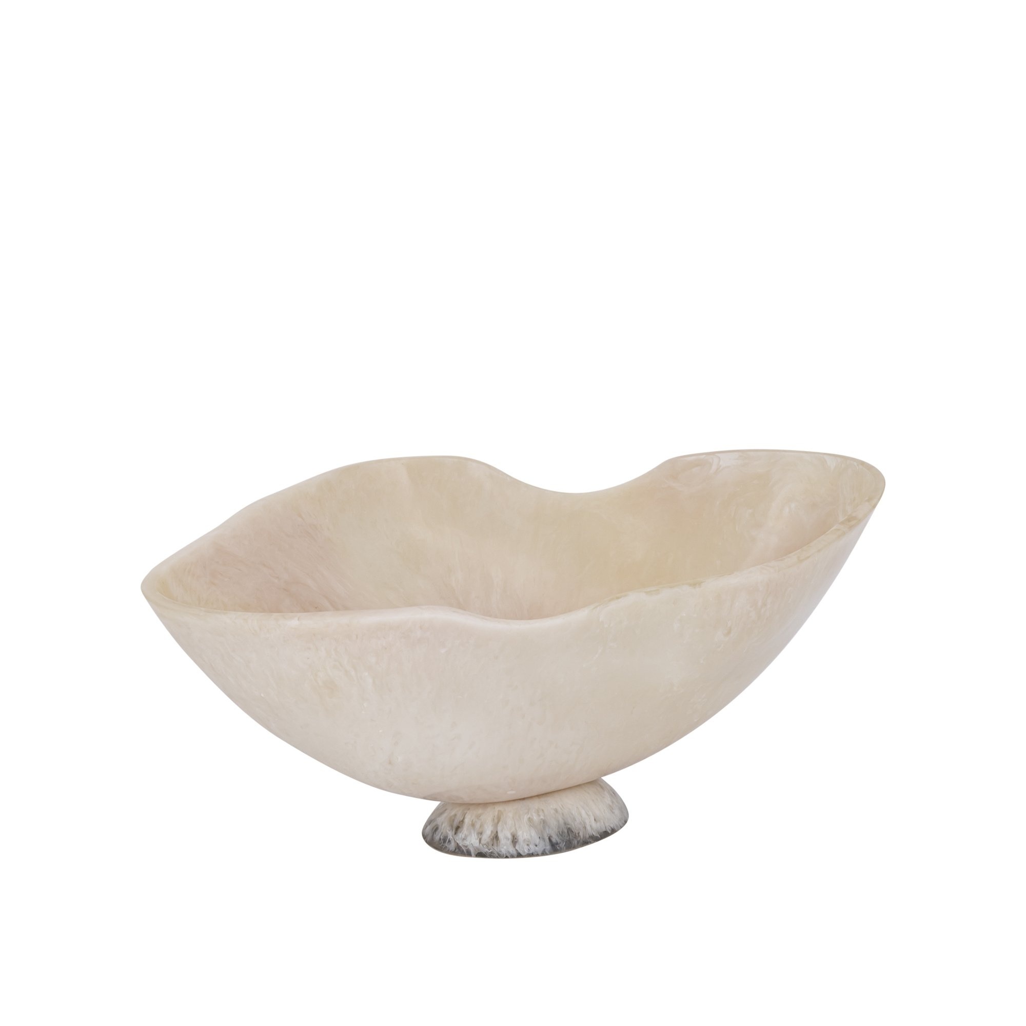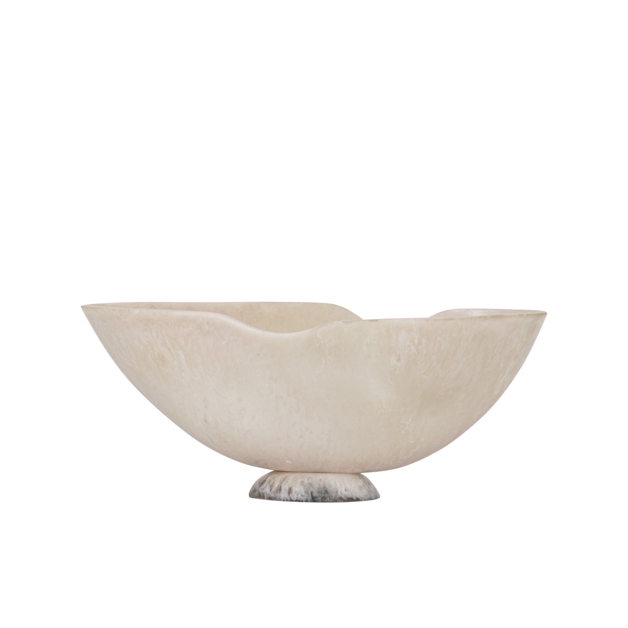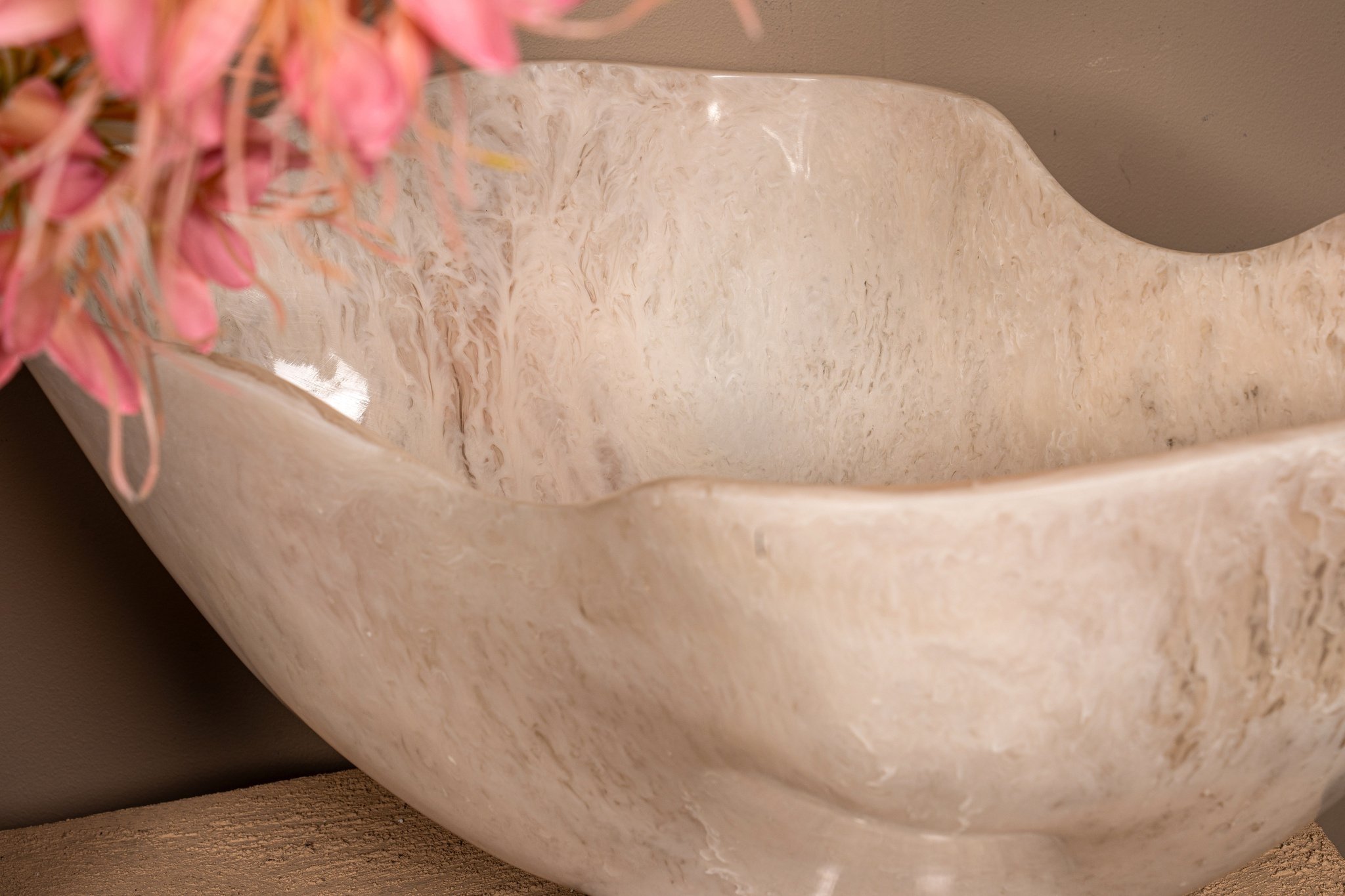 De schaal is handgemaakt van polyresin, een sterk en licht materiaal dat zich uitstekend leent voor organische vormen. Door het ambachtelijke productieproces is iedere schaal uniek, met subtiele variaties in vorm en afwerking die bijdragen aan het karakter van het item.