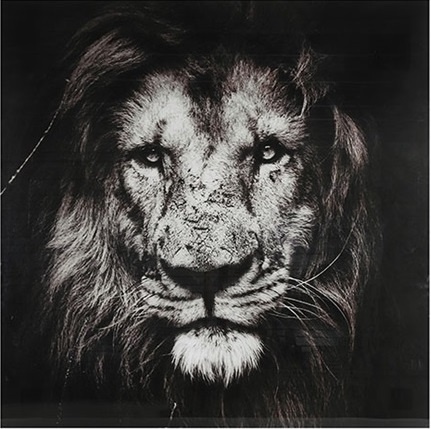 Deze close-up van een leeuw uitgevoerd in zwart-wit geeft een chique uitstraling. De afbeelding is afgedrukt op een glazen plaat.