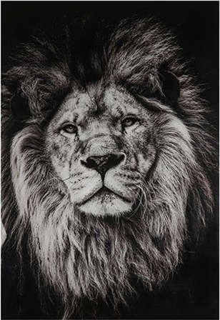 Deze close-up van een leeuw uitgevoerd in zwart-wit geeft een chique uitstraling. De afbeelding is afgedrukt op een glazen plaat.