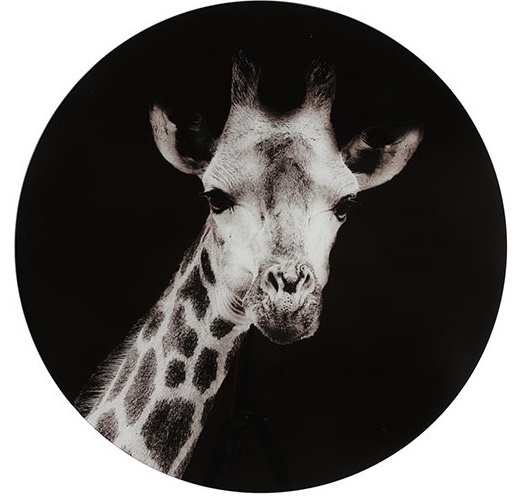 Deze close-up van een giraffe uitgevoerd in zwart-wit geeft een chique uitstraling. De afbeelding is afgedrukt op een glazen plaat.