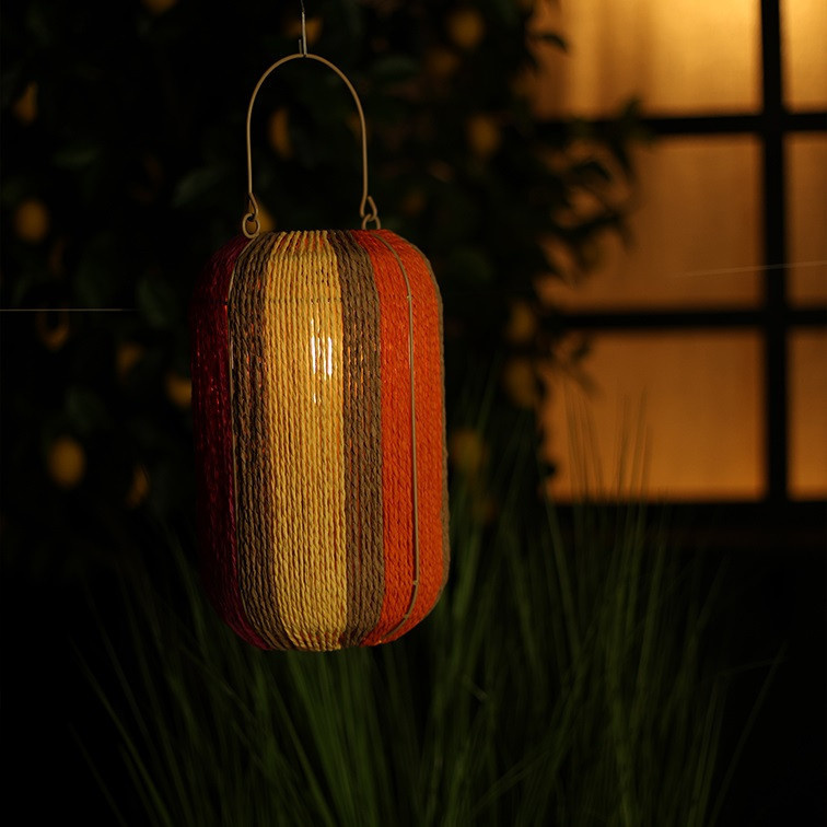 De ronde vorm, het slanke handvat en het zachte jute geven de lantaarn een rustgevende uitstraling, terwijl de veelkleurige banen zorgen voor een frisse en uitnodigende look.