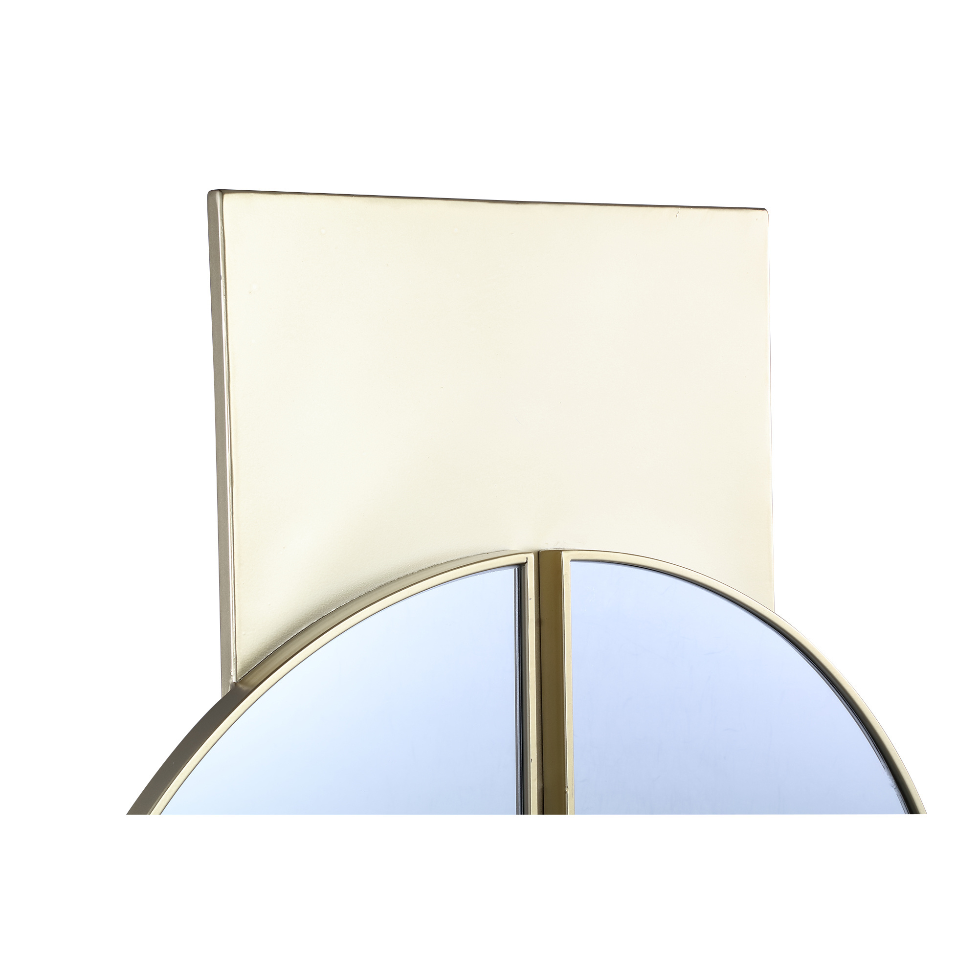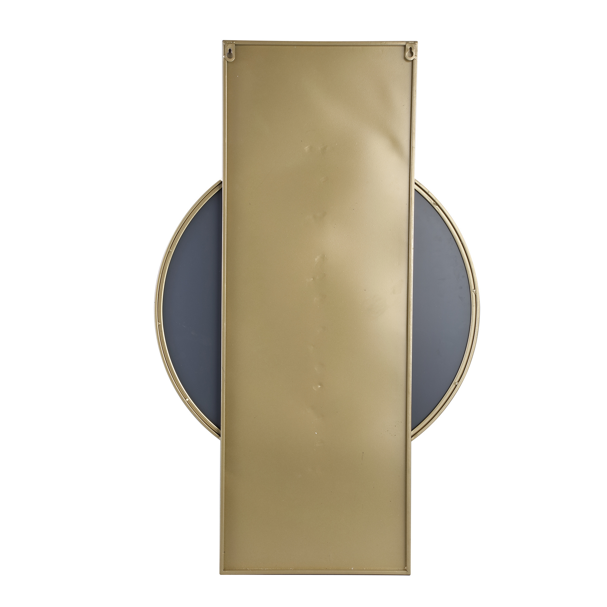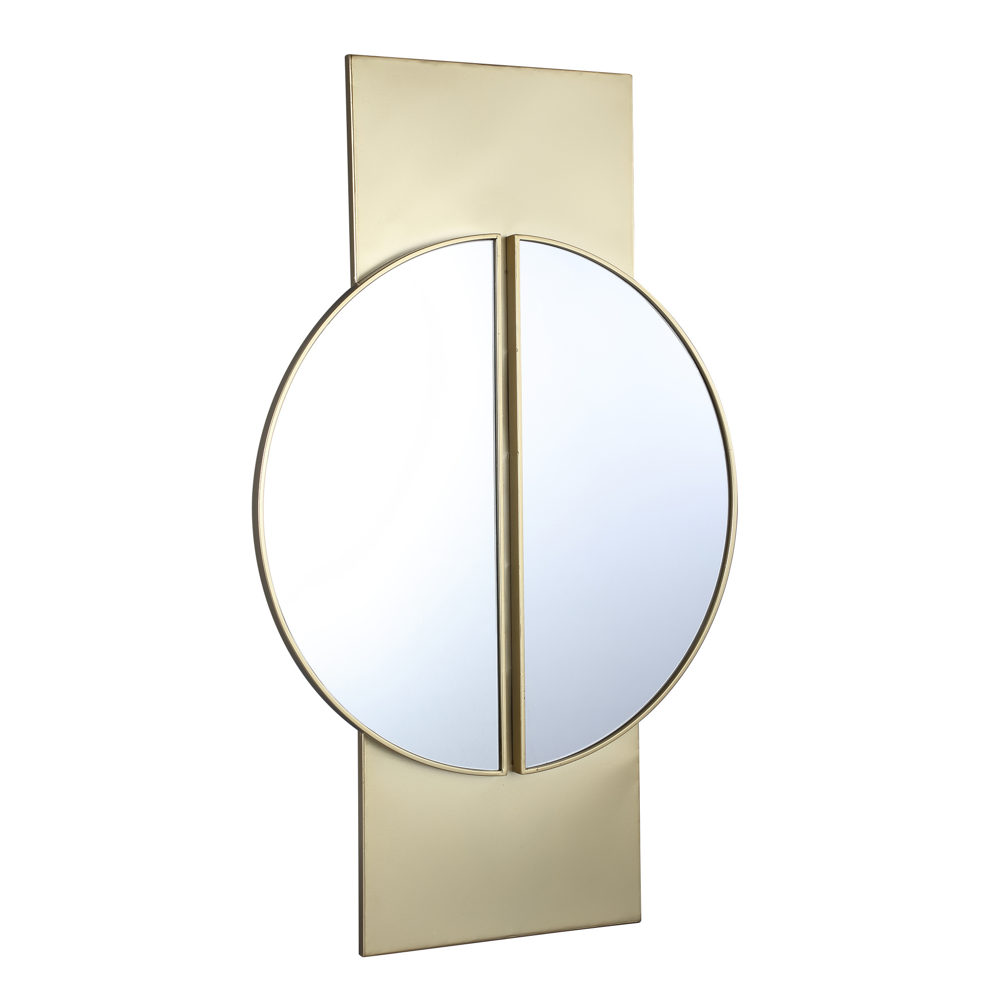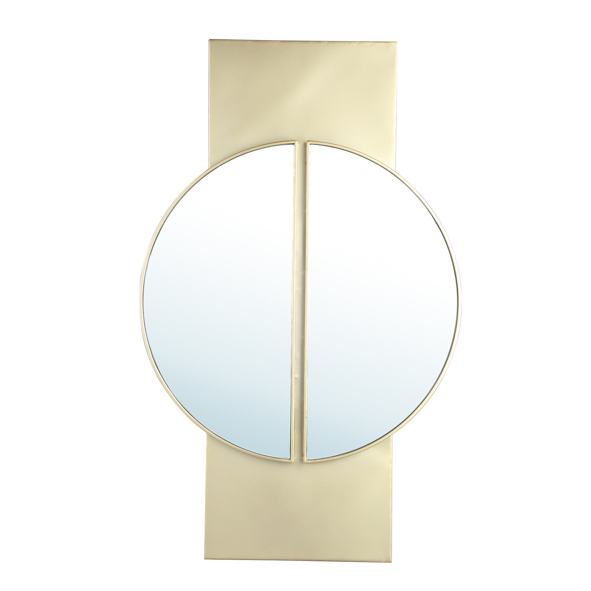 De Keller is een unieke spiegel met een modern uiterlijk. Het paneel achter de spiegel is gemaakt van goudkleurig metaal in een rechthoekige vom. De ronde spiegel is in twee delen gesplitst van halve manen en is omringt door een goudmetalen frame. Deze spiegel is een moderne toevoeging voor je interieur.