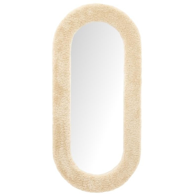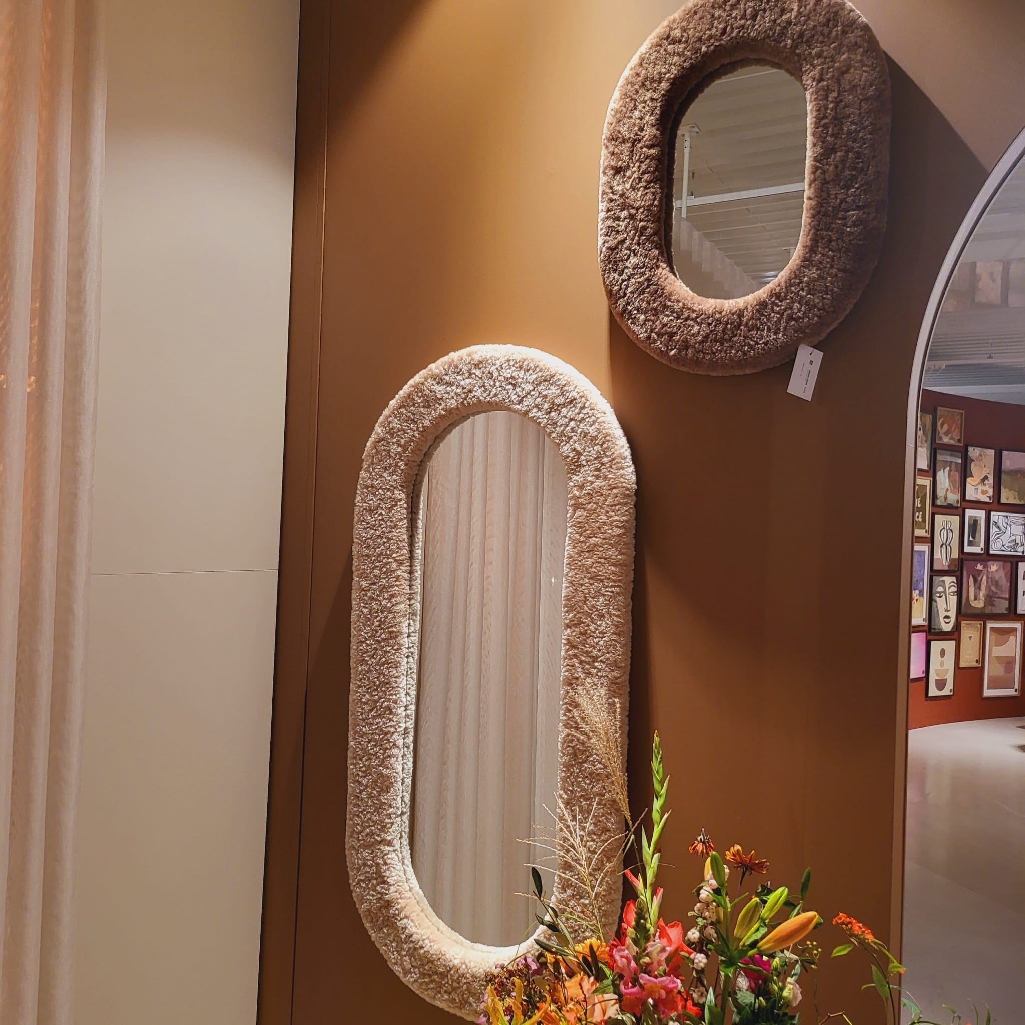 De Spiegel Kiss groot valt op door zijn ovale vorm en de brede rand die bekleed is met een zachte stof in een warme beige tint. Dit geeft de spiegel een elegante en tegelijk moderne uitstraling.