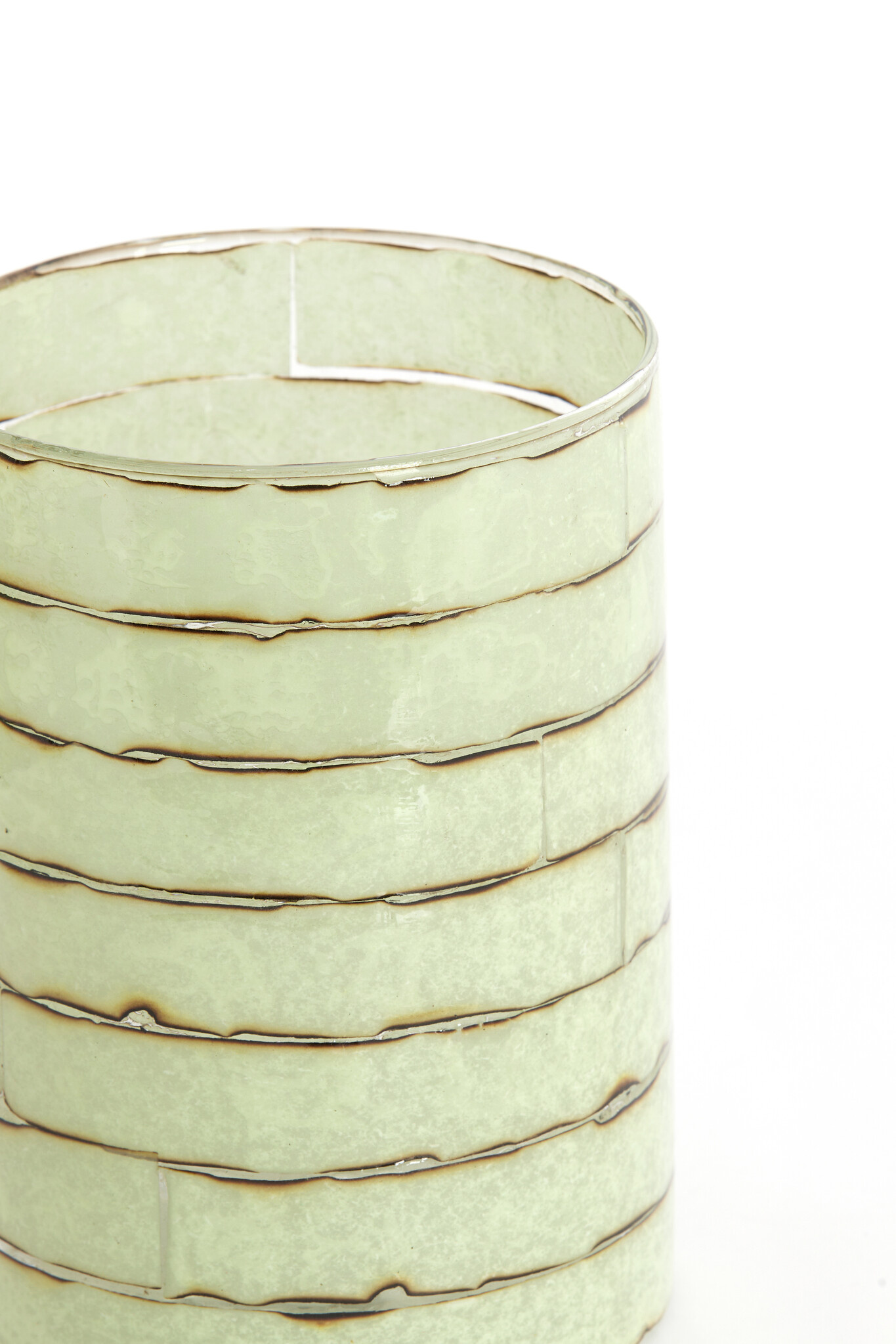 Geef je interieur een subtiele, frisse touch met het DRONERI theelicht van Light & Living. Dit stijlvolle theelicht is vervaardigd uit helder glas met een speels patroon in zacht mintgroen, afgewerkt met subtiele donkere accenten tussen de glasstroken voor extra diepte en karakter.