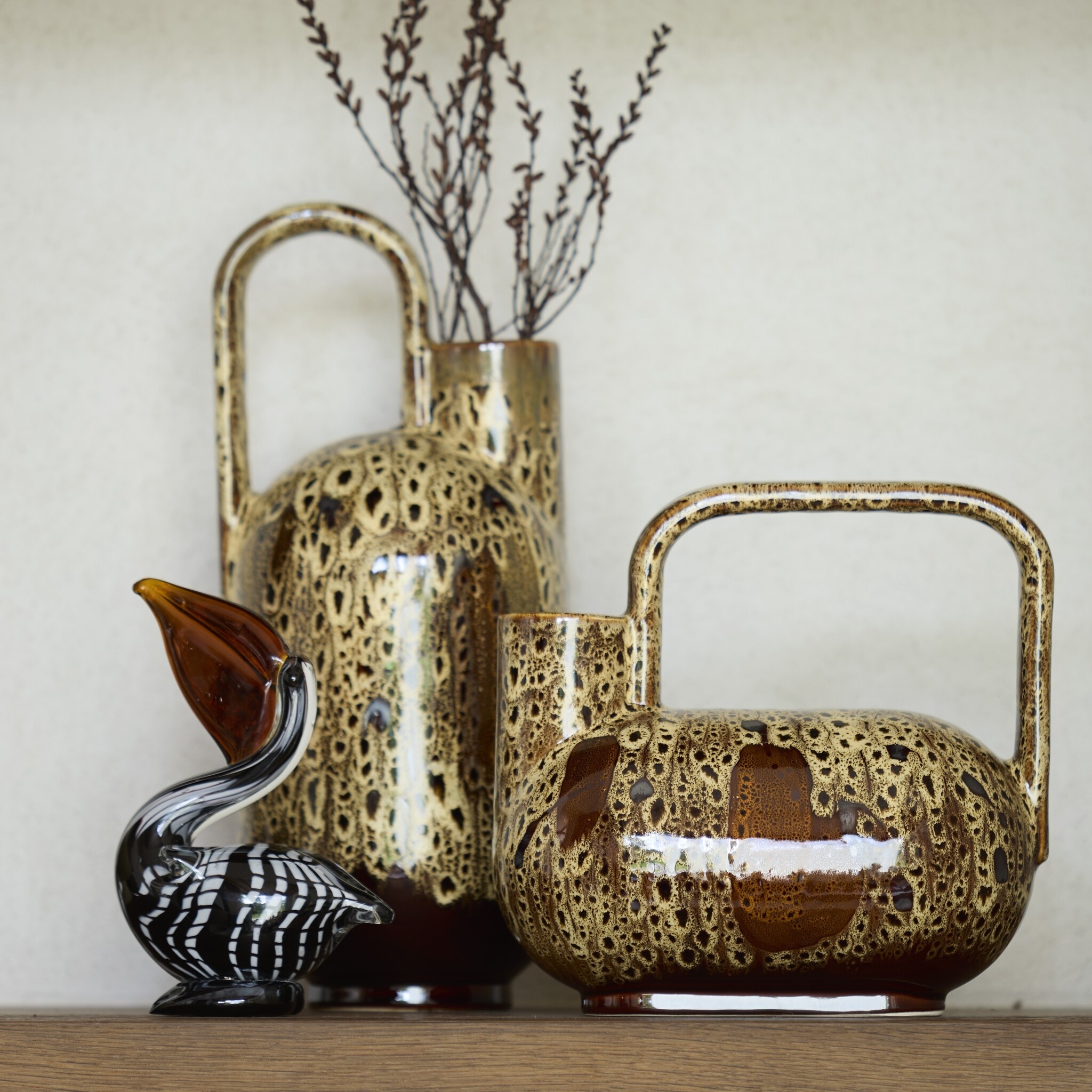 De hoge, ranke hals en het elegante handvat zorgen voor een modern, sculpturaal effect. Perfect als opzichzelfstaand decoratiestuk, maar ook stijlvol met enkele droogtakken of pluimen. Dankzij de neutrale kleuren past SERRES moeiteloos in een modern, industrieel, chique of organisch interieur.