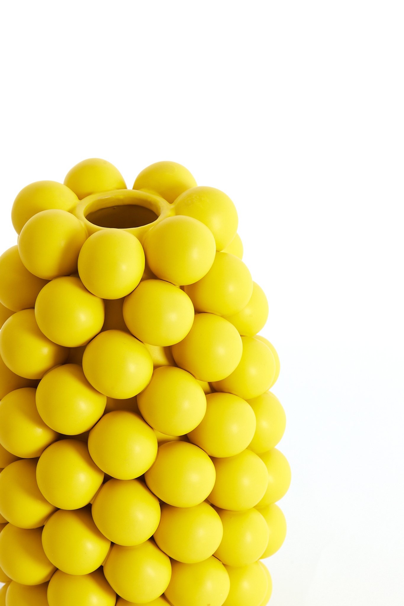 Deze mooie ronde vaas bestaat uit allemaal gele ballen. Dit maakt de vaas zo mooi, dat er haast geen bloemen meer nodig zijn om hier een eyecatcher van te maken. Deze vaas past in verschillende soorten interieurs. De vaas is ook in andere maten en kleuren beschikbaar.