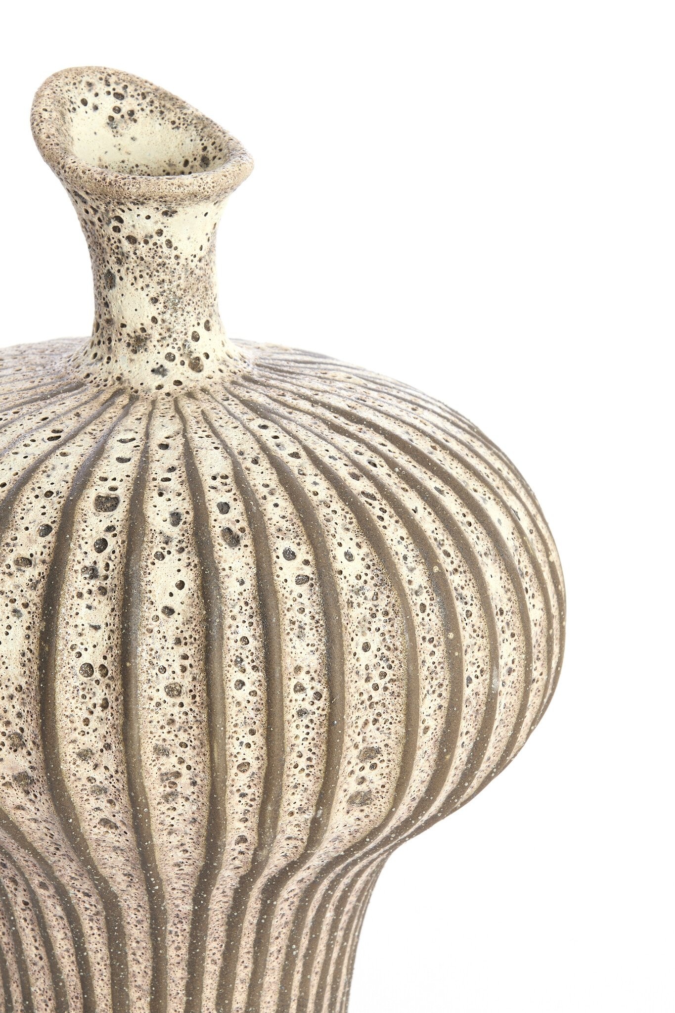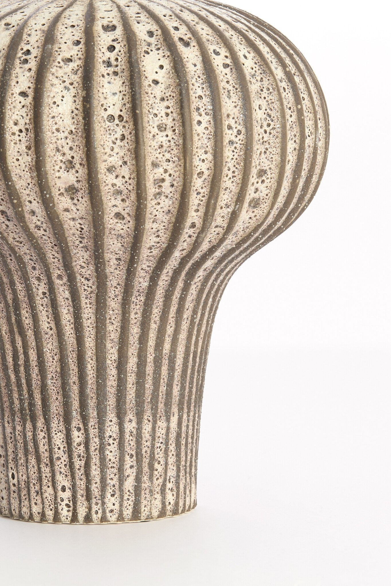 De combinatie van mat donkerbruin en crème geeft de vaas een rustige, natuurlijke uitstraling. De verticale ribbels en de subtiele poriën in het oppervlak zorgen voor diepte en karakter. Elke vaas is uniek door de licht variërende structuur en afwerking.