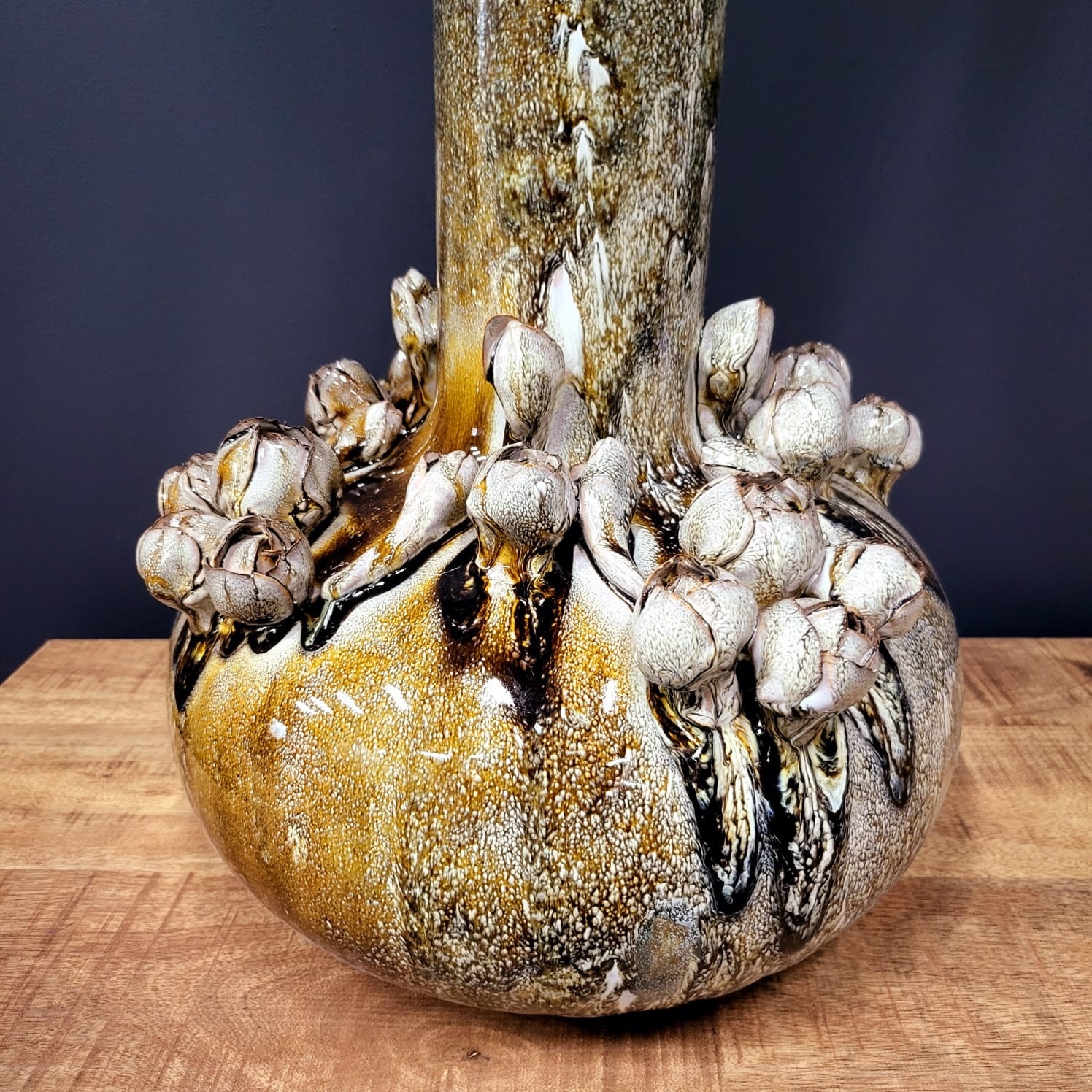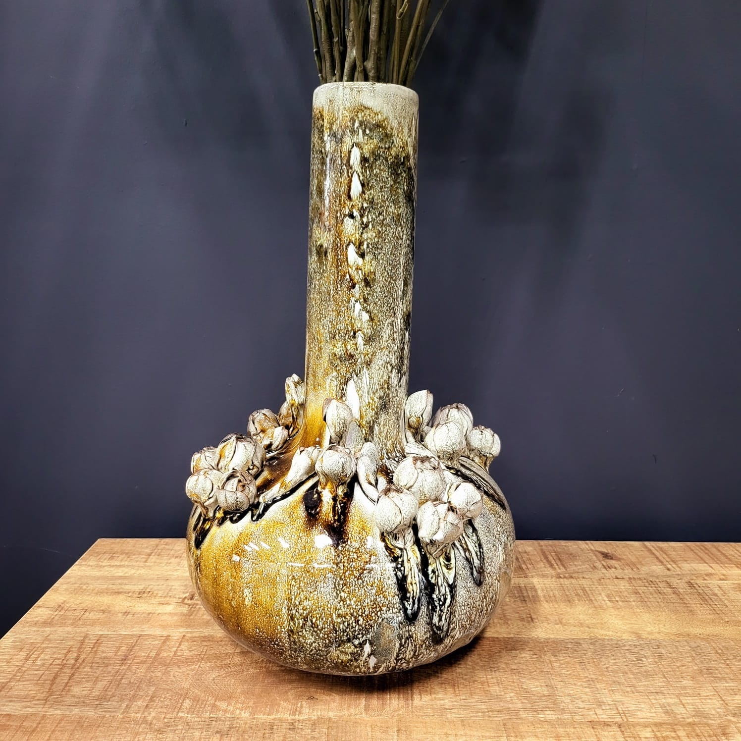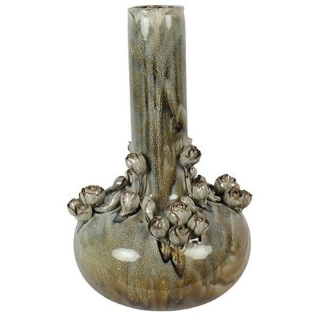 Deze keramieken vaas is vervaardigd uit hoogwaardig pottery, wat zorgt voor een robuuste, duurzame en luxe uitstraling. De roosvormige accenten rondom de slanke hals geven het geheel een romantische, bijna barokke flair, perfect voor wie houdt van opvallende woonaccessoires met een verhaal.