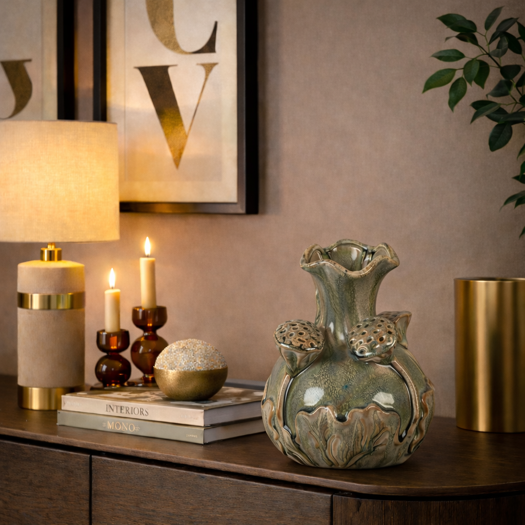 De groene kleur in terra tinten sluit prachtig aan bij groene planten, droogbloemen en aardse materialen zoals hout, linnen en keramiek. Dankzij het compacte formaat van 20x20x25 cm is deze vaas ideaal voor kleinere ruimtes zoals een bijzettafel, vensterbank of open kast.