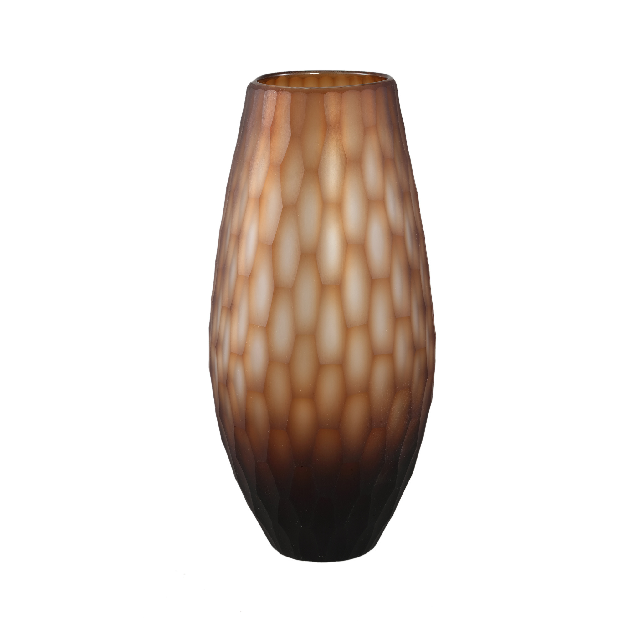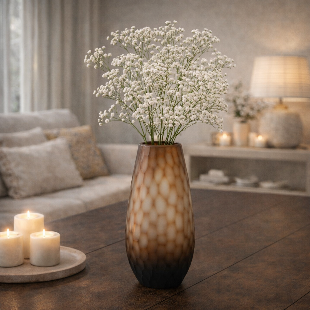De Vaas Niels Donkerbruin handgemaakt rond L straalt pure elegantie uit. De diepe bronzen kleur verloopt subtiel van licht naar donker en geeft de vaas een warme, luxe uitstraling. Het verfijnde patroon in het glas zorgt voor extra diepte en een speels lichtspel.