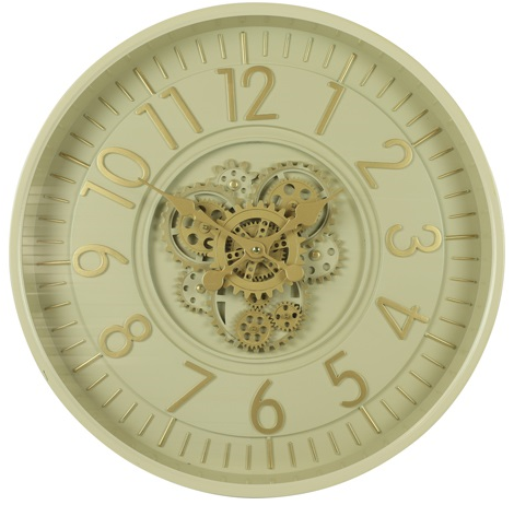 Deze crèmekleurige ronde wandklok met gouden grote cijfers van Countryfield heeft een rond rustiek design met bronzen wijzers en open tandwielen. Dit model klok is verkrijgbaar in een meerdere afmetingen en kleuren. Deze tijdloze klok is een echte eyecatcher en dat is toch precies wat een klok moet zijn. Je kijkt toch het liefst naar een mooie klok?