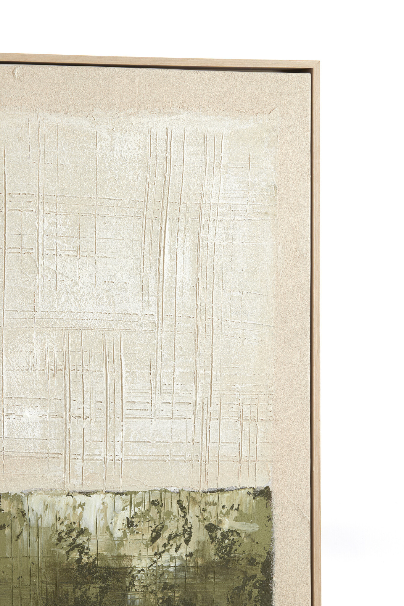 De abstracte vormen en natuurlijke tinten maken dit wandornament ideaal voor interieurs in Scandinavische, Japandi of minimalistische stijl. Het zachte kleurgebruik brengt balans en harmonie in de ruimte, terwijl de structuur en details zorgen voor een uniek visueel effect. De houten lijst in een naturel kleur geeft het geheel een warme en natuurlijke uitstraling.