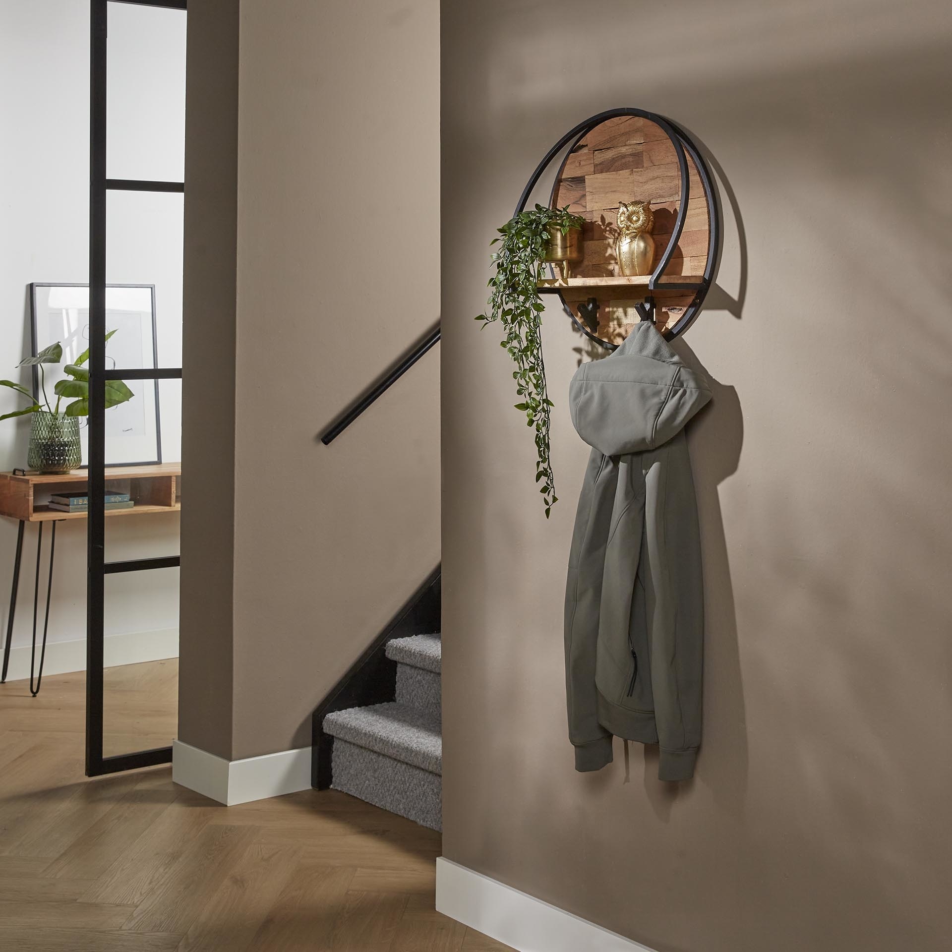 Dit wandschapje 'mill' is uitgevoerd in acacia hout. Het schapje beschikt over 2 haakjes waar bijvoorbeeld een jas of sleutels aan opgehangen kunnen worden.