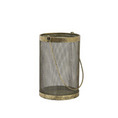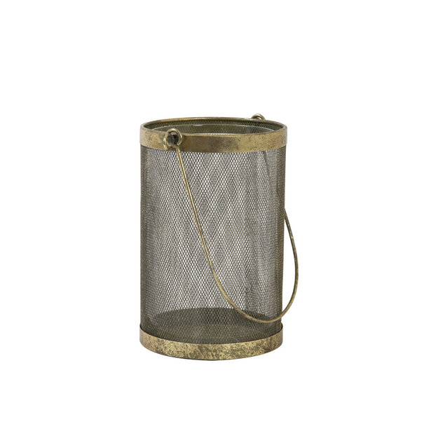 Een metalen windlicht in antiek bronze kleur. Het licht schijnt fraai door het gaas en verspreid daarmee een fijne sfeer.
