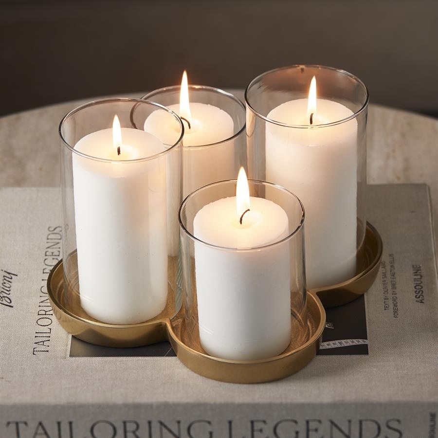Het heldere glas zorgt voor een prachtig, zacht lichtspel wanneer de kaarsen branden, terwijl de gouden metalen schaal een luxe en tijdloze uitstraling geeft. Perfect voor romantische avonden, gezellige diners of als decoratief accent in elk interieur.