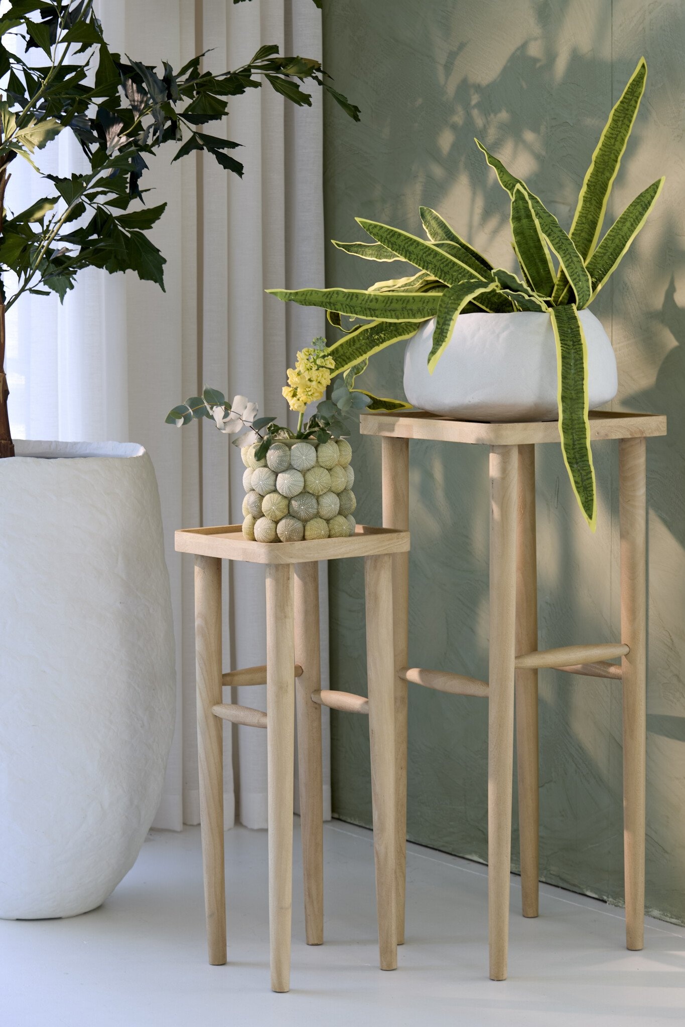 Breng natuurlijke elegantie in jouw interieur met de QIANO zuilen van mango hout. Deze stijlvolle plantenzuilen combineren een luchtig, modern design met de warme uitstraling van massief hout. Dankzij het slanke onderstel en het subtiel opstaande blad vormen ze een perfecte basis voor planten, vazen, kunstobjecten of andere pronkstukken.